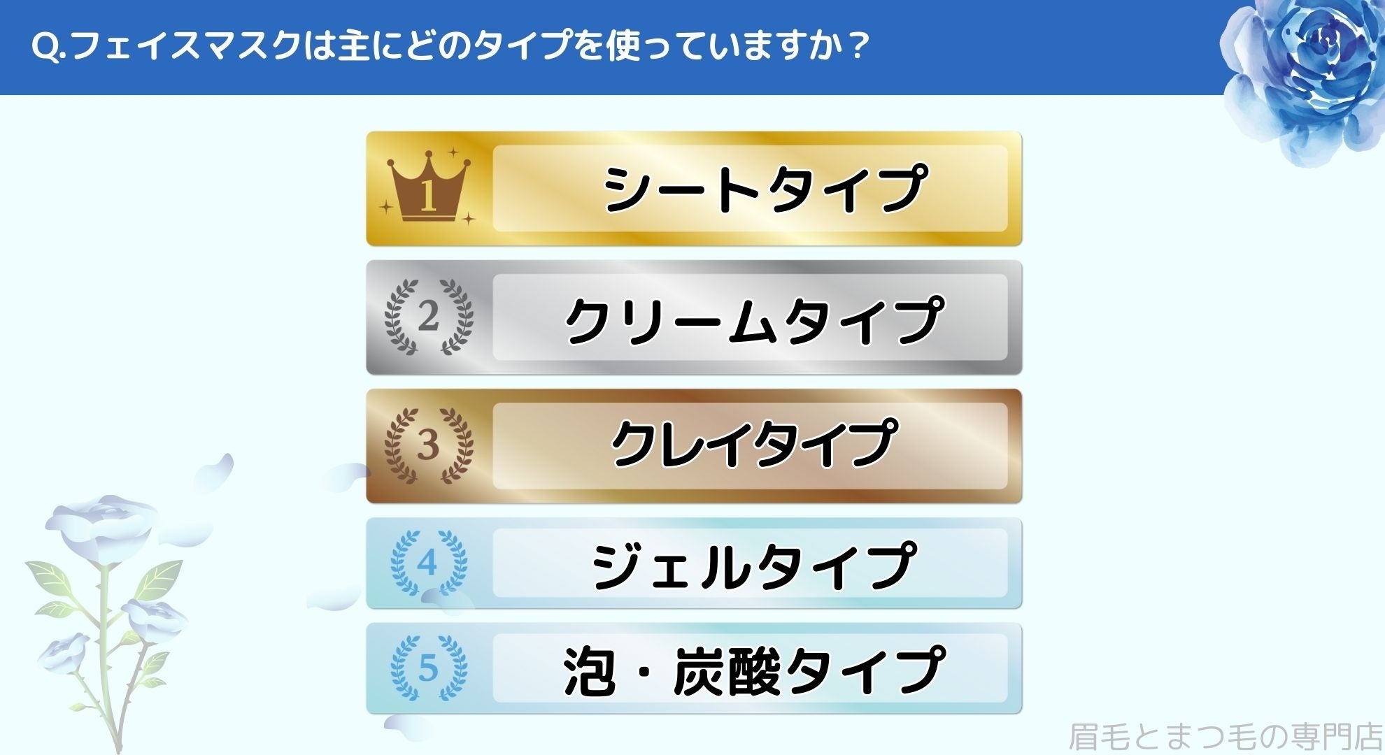 フェイスマスクのタイプについてお聞きしたところ「1位>シートタイプ」、「2位>クリームタイプ」、「3位>クレイタイプ」、「4位>ジェルタイプ」、「5位>泡・炭酸タイプ」という結果になりました。