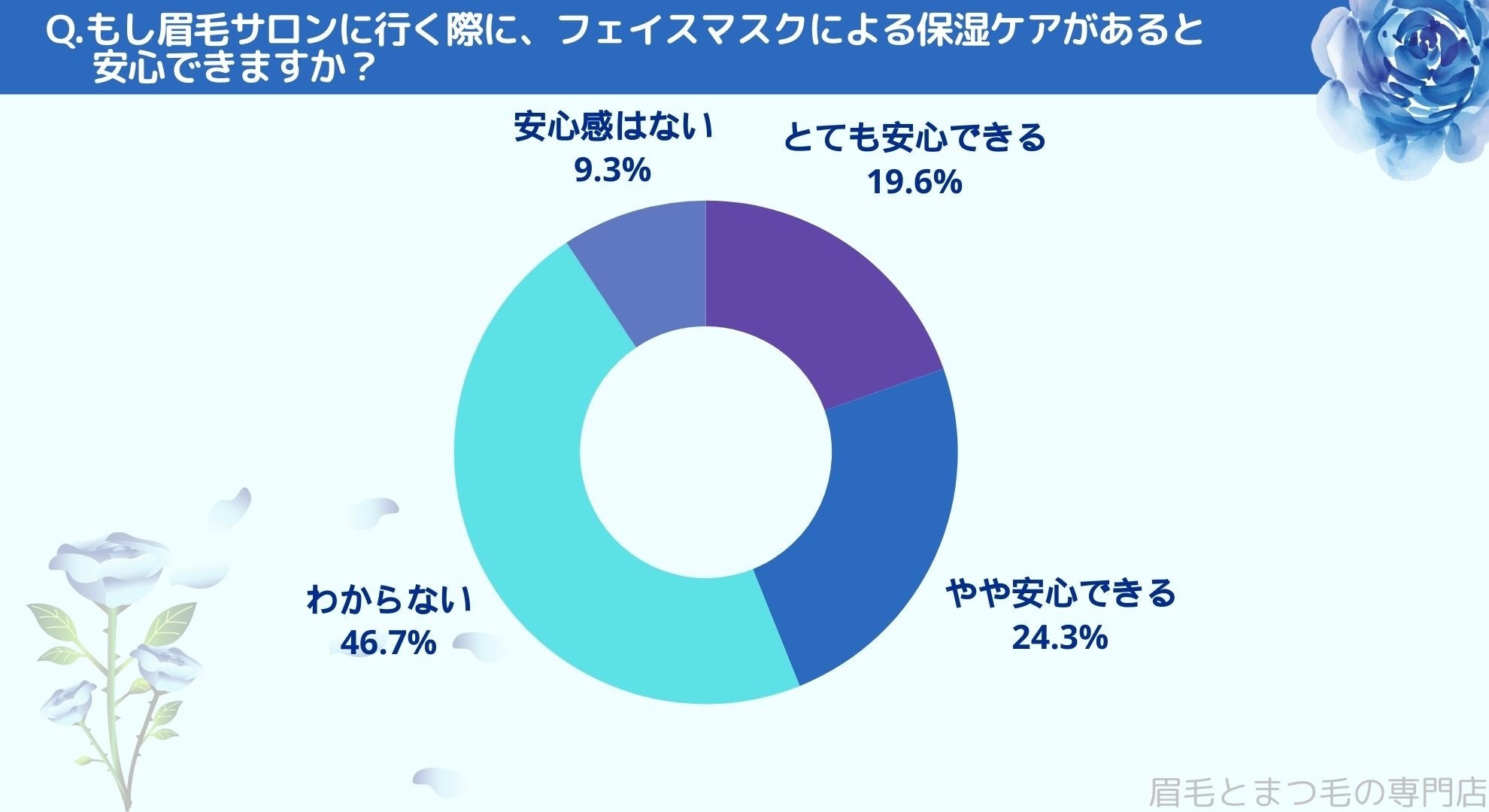 もし眉毛サロンに行く際に、フェイスマスクによる保湿ケアがあると安心できるかお聞きしたところ「とても安心できる(19.6%)」、「やや安心できる(24.3%)」、「わからない(46.7%)」、「安心感はない(9.3%)」という結果になりました。