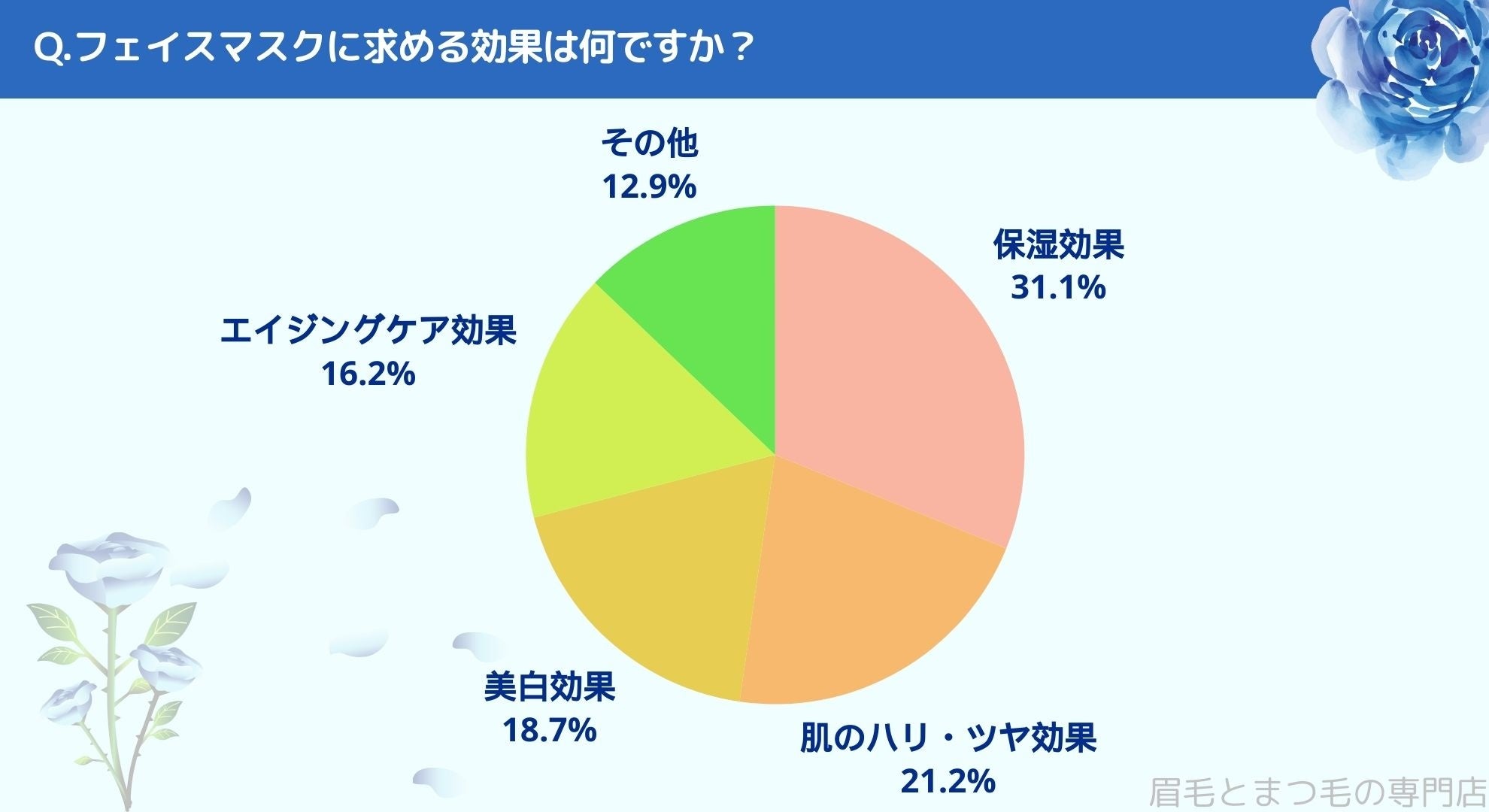 フェイスマスクに求める効果をお聞きしたところ「保湿効果(31.1%)」、「肌のハリ・ツヤ効果(21.2%)」、「美白効果(18.7%)」、「エイジングケア効果(16.2%)」、「その他(12.9%)」という結果になりました。
