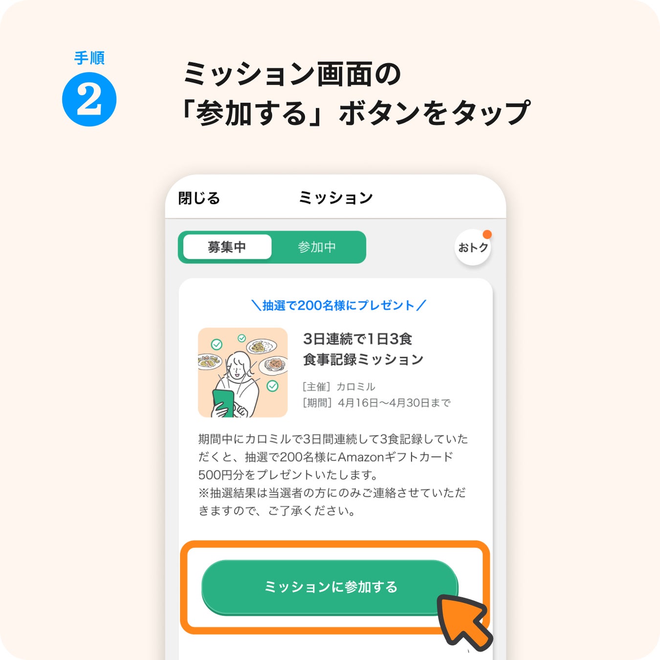 カロミルミッションは、食と健康にまつわるキャンペーンやイベントの情報をまとめてみることができるページです。気になるミッションを選択して「参加」ボタンをタップするだけで、簡単にキャンペーンに参加ができます。