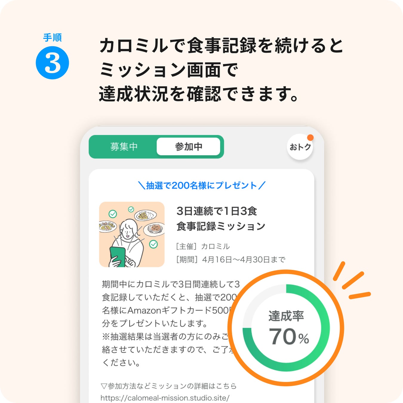 食事・運動・体重管理アプリケーション(以下アプリ)「カロミル」の開発・提供をするライフログテクノロジー株式会社(東京都中央区、代表取締役:棚橋繁行、以下当社)は、カロミル上で開催中のキャンペーンや様々な情報を発信する新機能「カロミルミッション」をリリースしました。キャンペーンやイベント等の情報をアプリ内で1ページにまとめてお届けすることで、カラダの課題解決に取り組むカロミルユーザーの食×健康の取り組みを一層サポートします。今回、「カロミルミッション」のリリースを記念し、当社主催キャンペーンを実施します。4月16日(火)~4月30日(火)の期間中、カロミルで3日間連続して3食分を記録すると、抽選で200名にAmazonギフトカード500円分をプレゼントします。