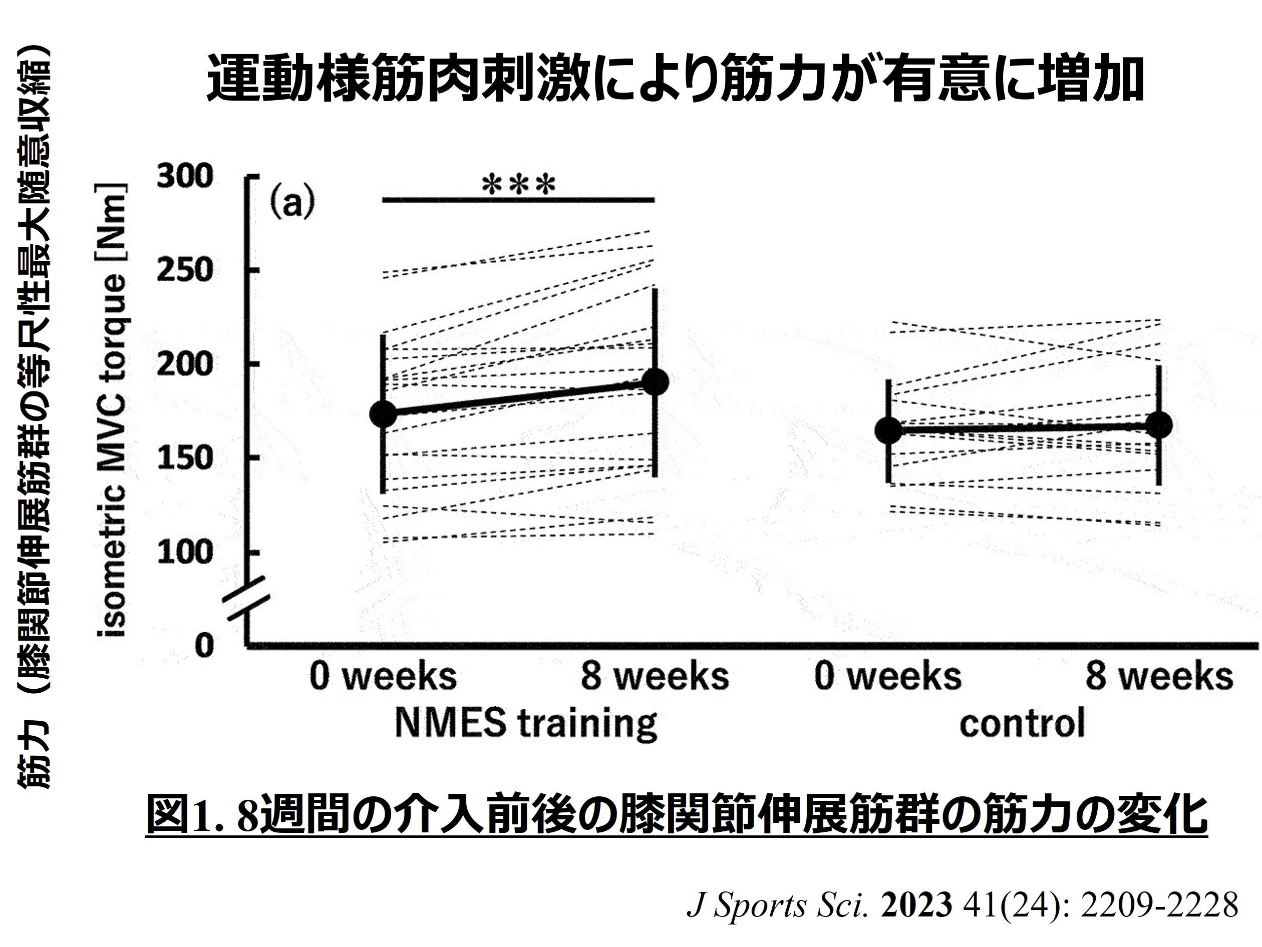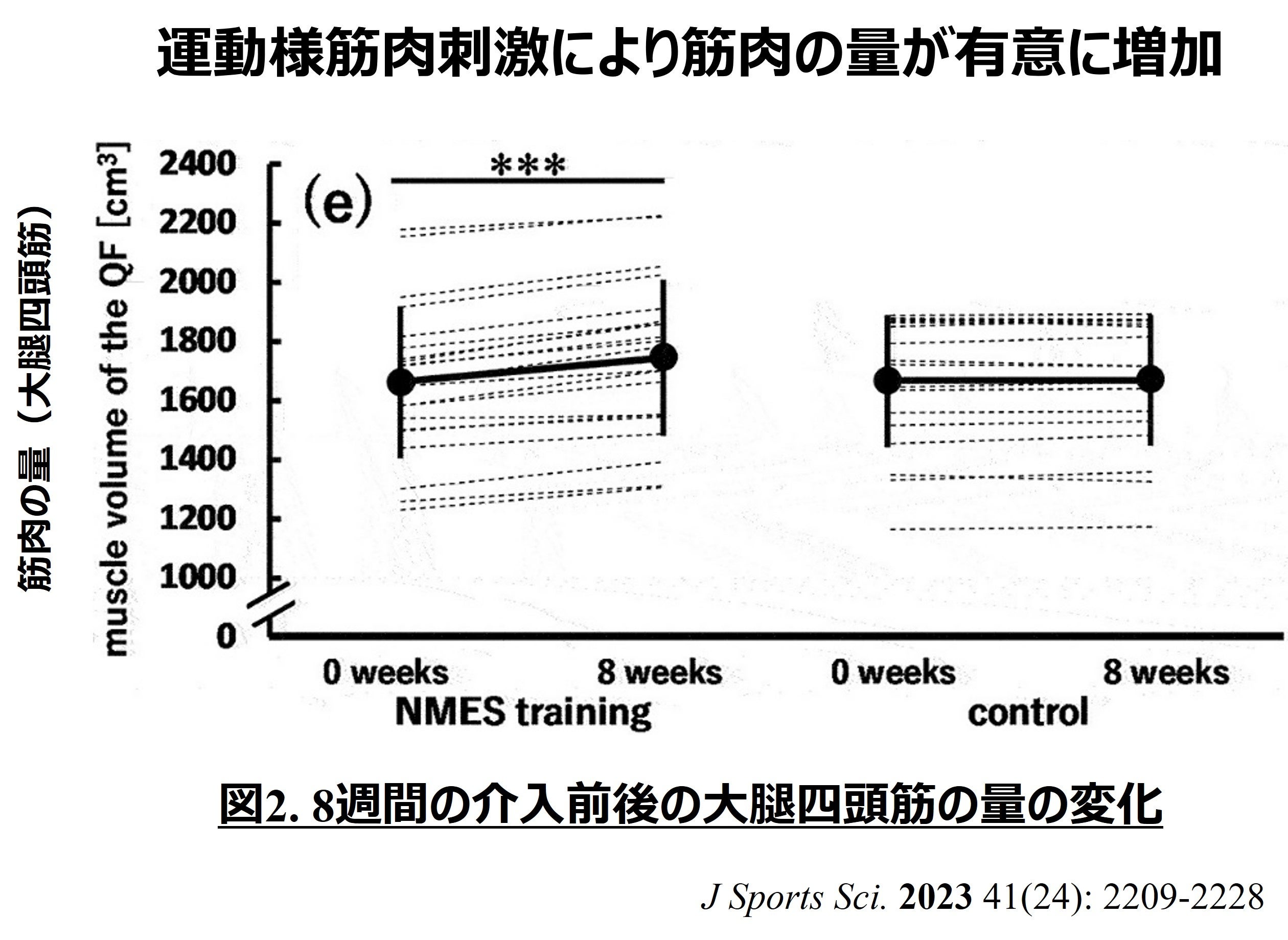 本研究では、若年男性39名(平均年齢22歳)をランダムに対照群(n = 18)と介入群(n = 21)に分け、介入群は1回約14分の運動様筋肉刺激(NMES: neuromuscular electrical stimulation)を週3回実施しました。8週間の介入期間の前後で、介入群では筋力の増加(膝関節伸展筋群の等尺性最大随意収縮の有意な増加)、筋肉の量の増加(MRI検査による大腿四頭筋の量の有意な増加)、及び筋肉の質の改善(外側広筋の超音波エコー強度の有意な減少)が確認されました。