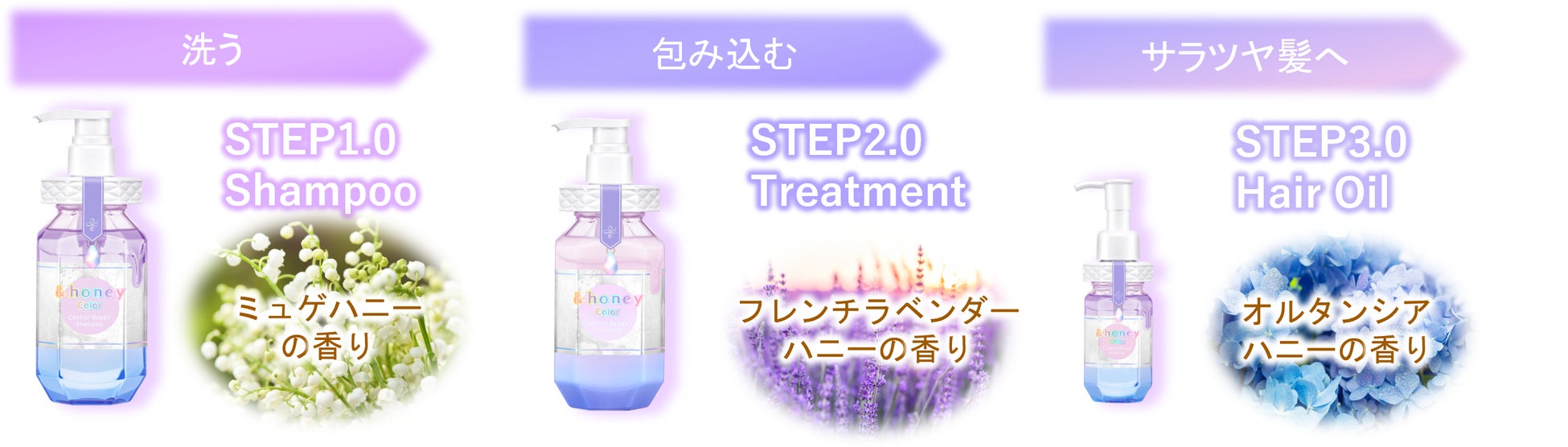 シャンプーはフランス産スズラン*9を使用したミュゲハニー、ヘアトリートメントはフランス産ラベンダー*10を使用したフレンチラベンダーハニーの香り、ヘアオイルは国内産アジサイ*11を使用したオルタンシアハニーの香りを採用。上品で華やかなフローラルが重なる香りをアイテムごとにお楽しみいただけます。
