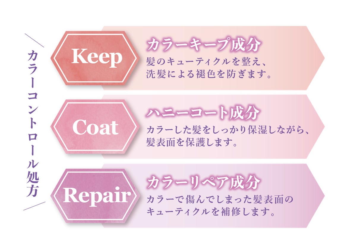 ヘアカラーを繰り返す髪にうるおいを与え、カラーコントロール処方により染めたての髪色をキープしサラツヤの仕上がりに導きます。