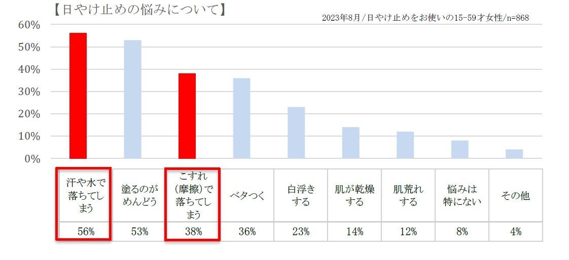 日やけ止めにおける悩みについては、「汗や水で落ちてしまう(56%)」、「塗るのがめんどう(53%)」が半数以上を占めています。「こすれで落ちてしまう」が38%と、塗った日やけ止めが日常生活の水・汗のふき取りや、洋服・かばんなどでのこすれにより落ちてしまうことに悩む女性が多いことがわかりました。