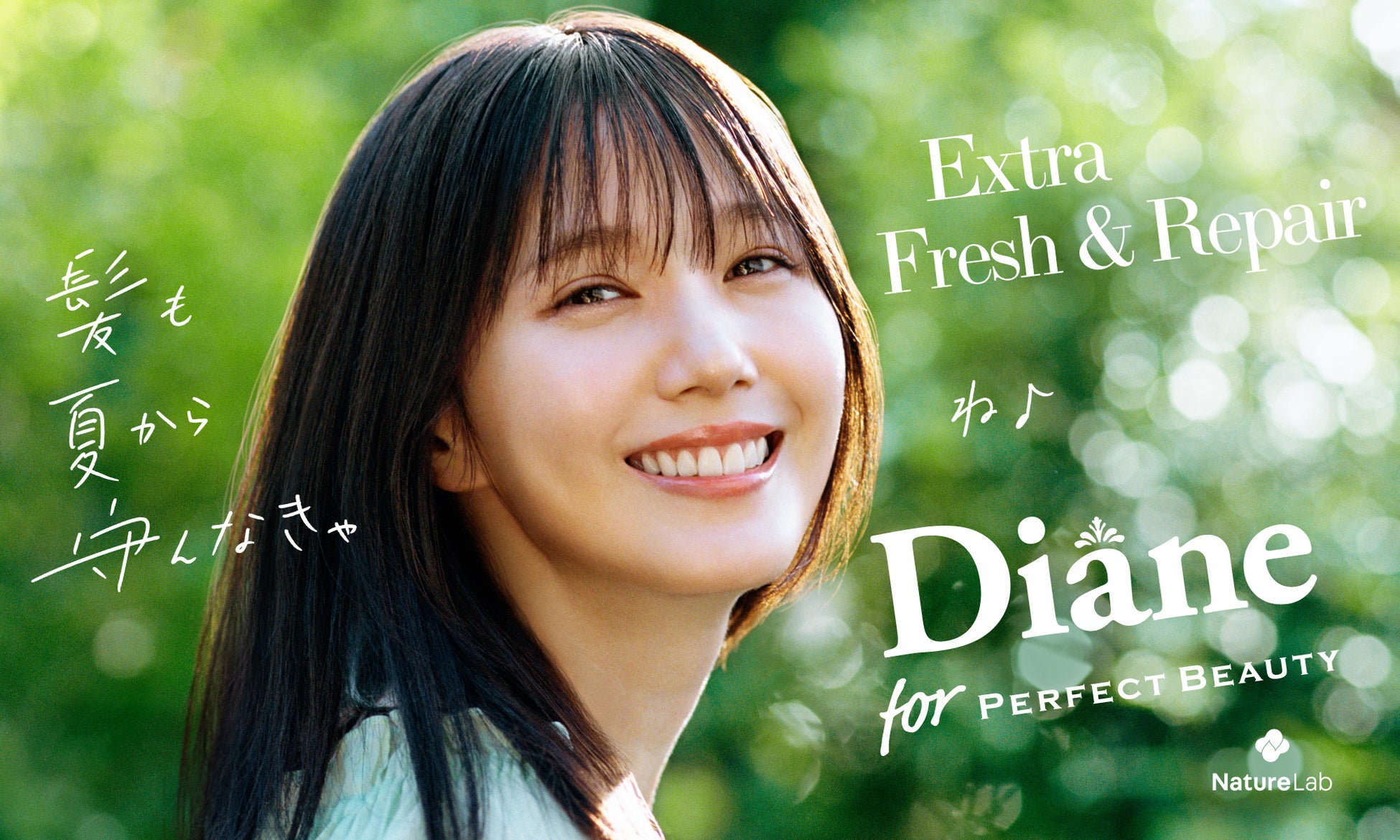 今回新たに撮り下ろしたキービジュアルは、夏の始まりを感じさせるような日差しの中で、本田さんが見せる爽やかな笑顔が印象的です。「髪も夏から守んなきゃ、ね♪」とこちらに話しかけているような、親近感の湧く本田さんの表情に惹きつけられます。「エクストラフレッシュ&リペア」本品のビジュアルも、夏の太陽に照らされているなか、グレープフルーツ&ペパーミントの香りのように涼しげな雰囲気に仕上げました。