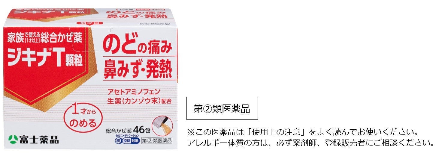 「ジキナ®T顆粒」は、1才から服用できる総合感冒薬です。かぜの諸症状を緩和する有効成分のほか、ビタミンB1、ビタミンB2、生薬(カンゾウ末)などを配合しており、かぜの初期症状から服用いただけます。また、46包の大容量のため、もしもの時のための常備薬としても活用いただけます。