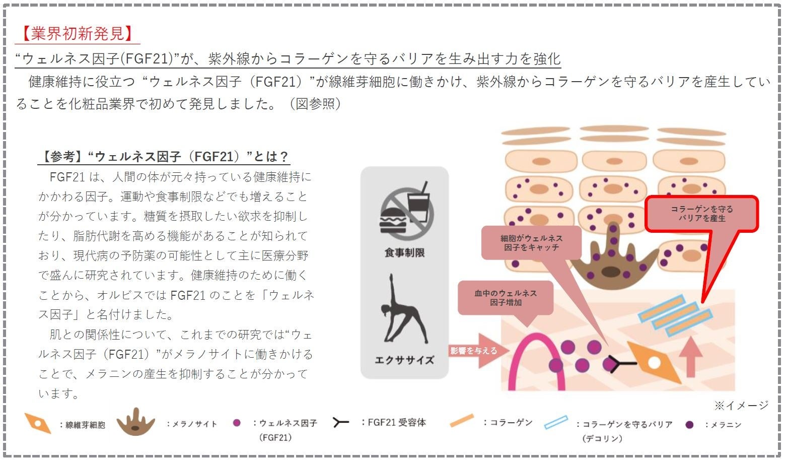 ※5 FGF21は、糖質を摂取したい欲求を抑制したり、脂肪代謝を高める機能があるなど、健康維持のために働くことから、オルビスでは「ウェルネス因子」と名付けました