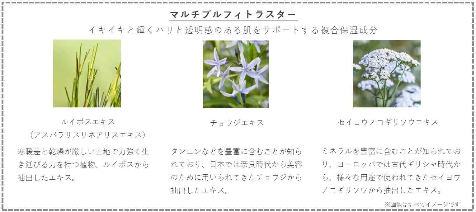 ハリと透明感のある肌を叶えるために、独自研究に基づいた複合保湿成分「マルチプルフィトラスター」を配合。