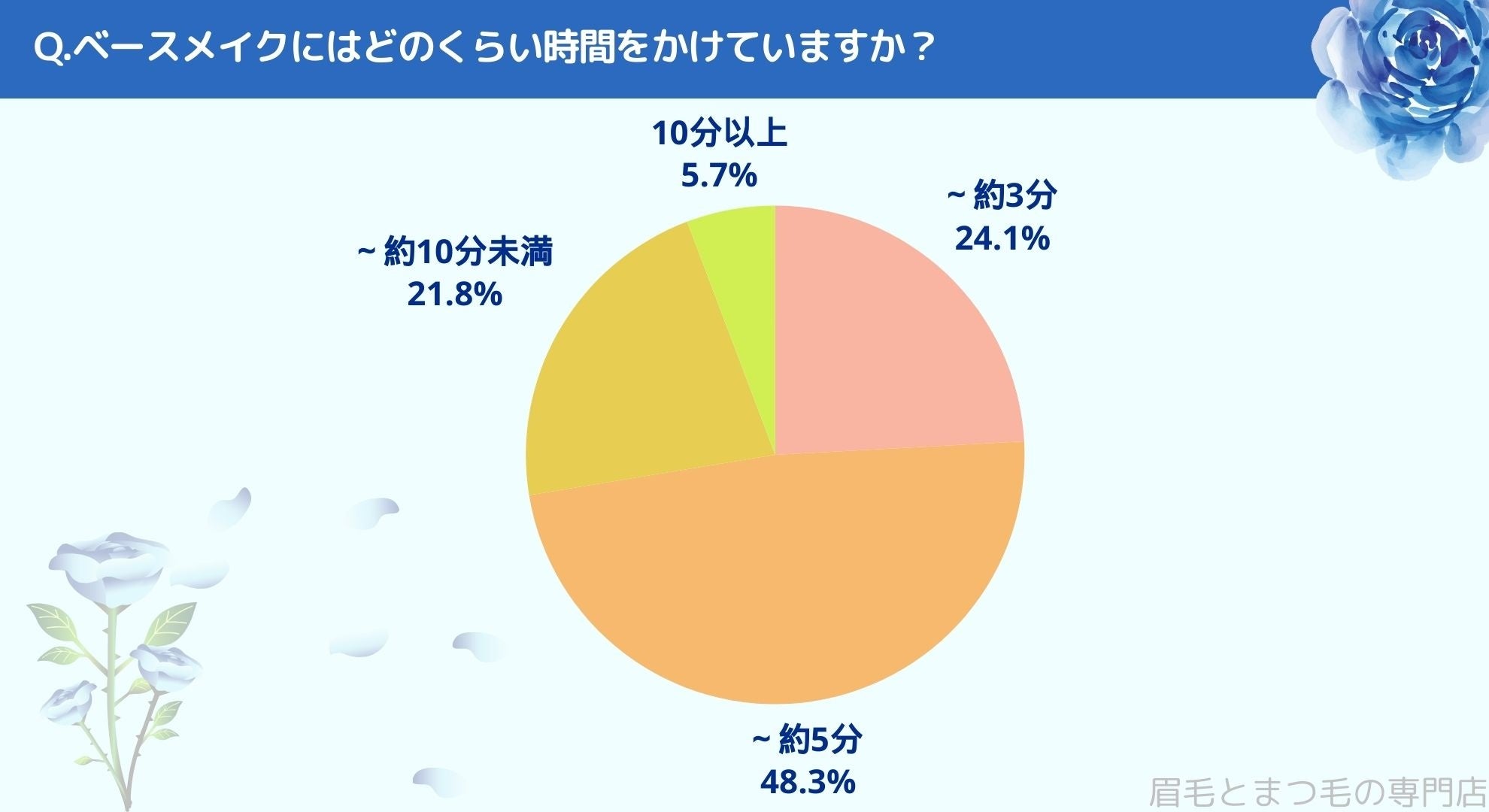 ベースメイクはどのくらい時間をかけているかお聞きしたところ「~約3分(24.1%)」、「~約5分(48.3%)」、「~約10分未満(21.8%)」、「約10分以上(5.7%)」という結果になりました。