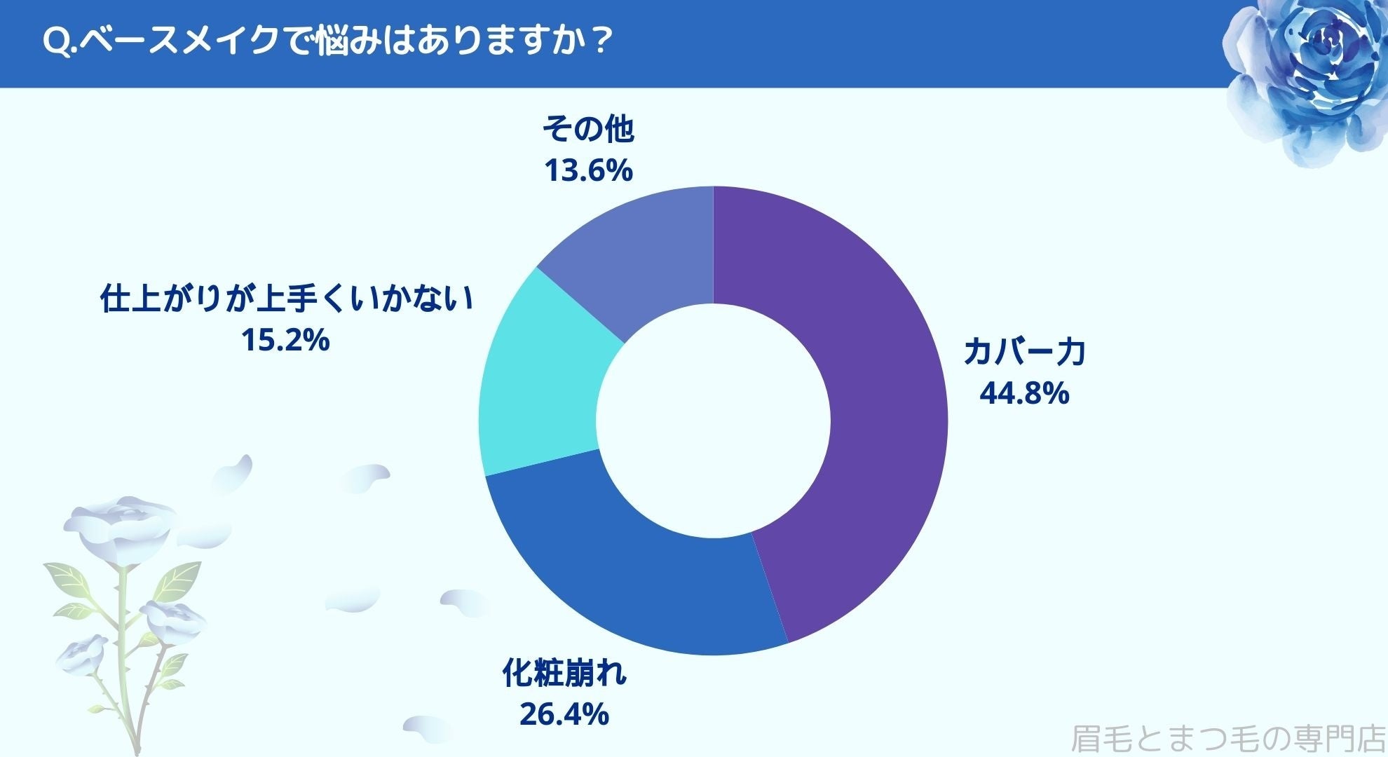 ベースメイクで何か悩みがあるかお聞きしたところ「カバー力(44.8%)」、「化粧崩れ(26.4%)」、「仕上がりが上手くいかない(15.2%)」、「その他(13.6%)」という結果になりました。