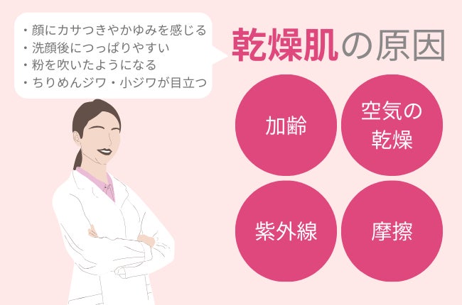 乾燥肌の主な原因は「加齢」「空気の乾燥」「紫外線」「摩擦」があげられます。
