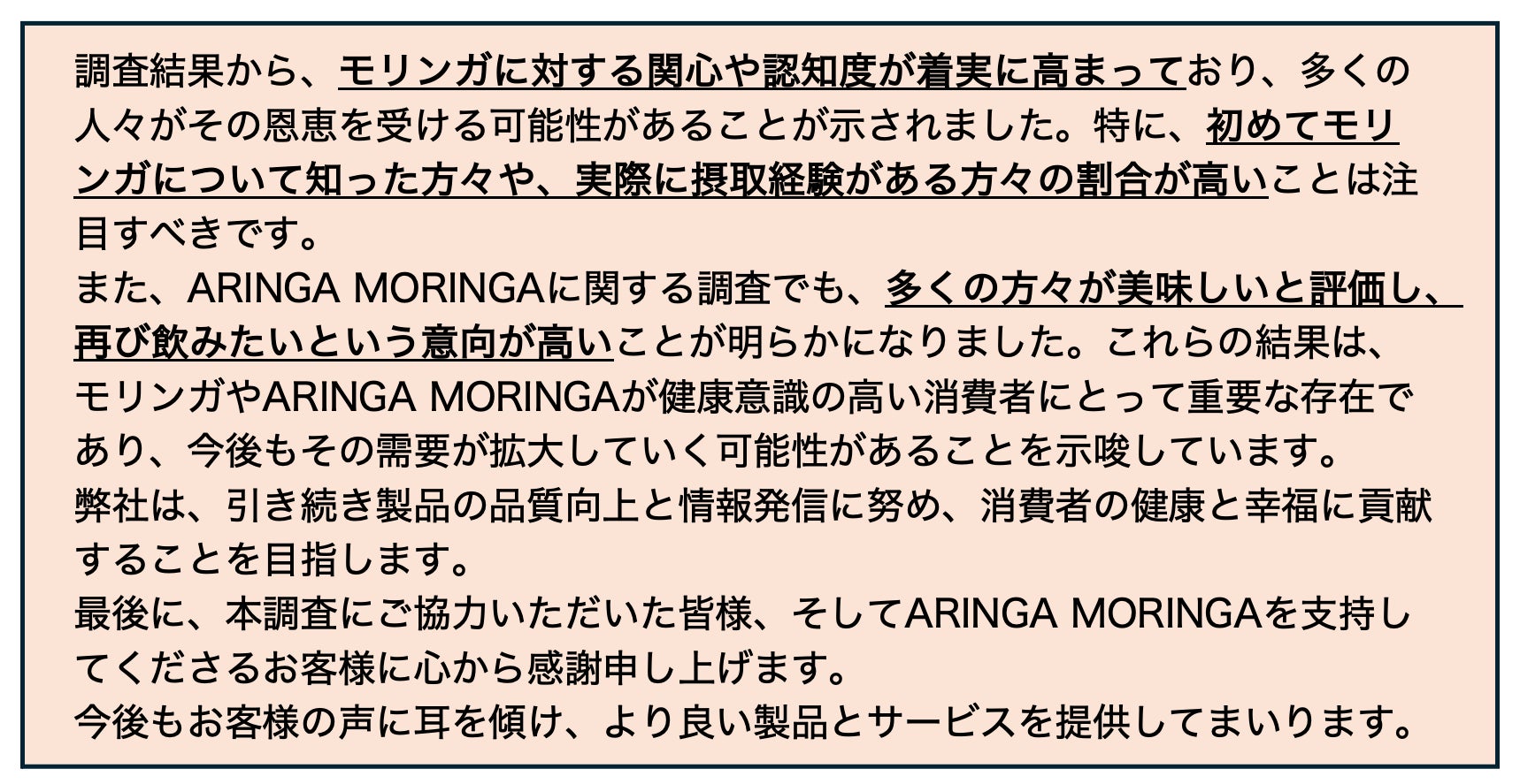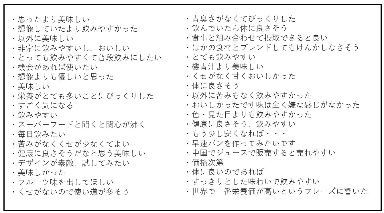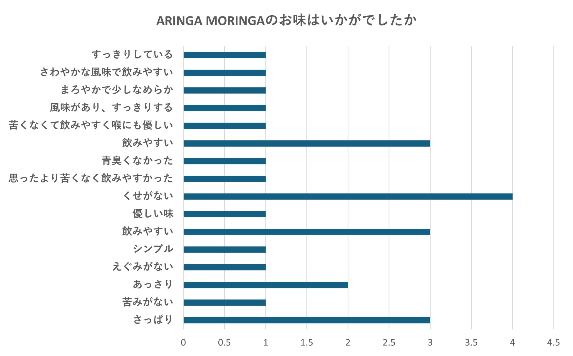 多くの方から、味に関する高評価を受けました。モリンガ=美味しくないという印象があった方も多く、ARINGA MORINGAがその意識を払拭できる商品になることが期待されます。
