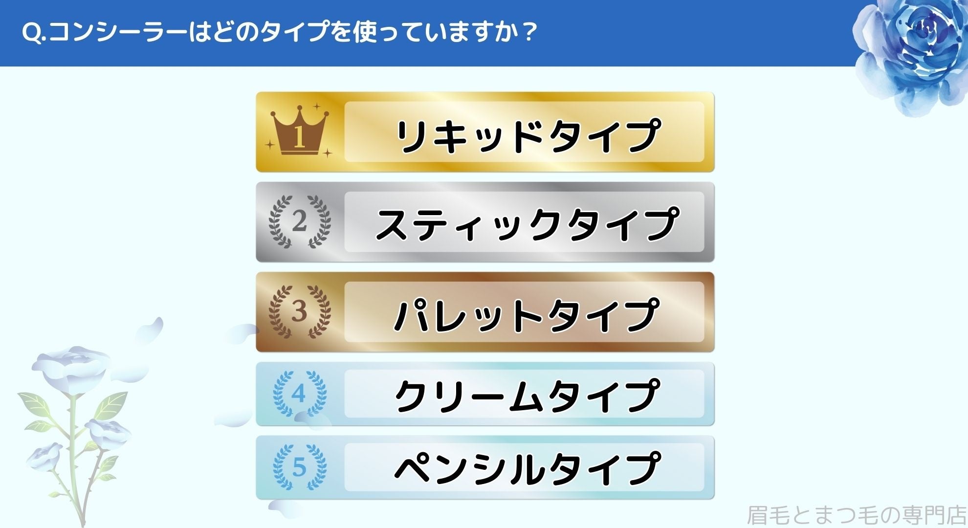 どのコンシーラータイプを使っているかお聞きしたところ「1位>リキッドタイプ」、「2位>スティックタイプ」、「3位>パレットタイプ」、「4位>クリームタイプ」、「5位>ペンシルタイプ」という結果になりました。
