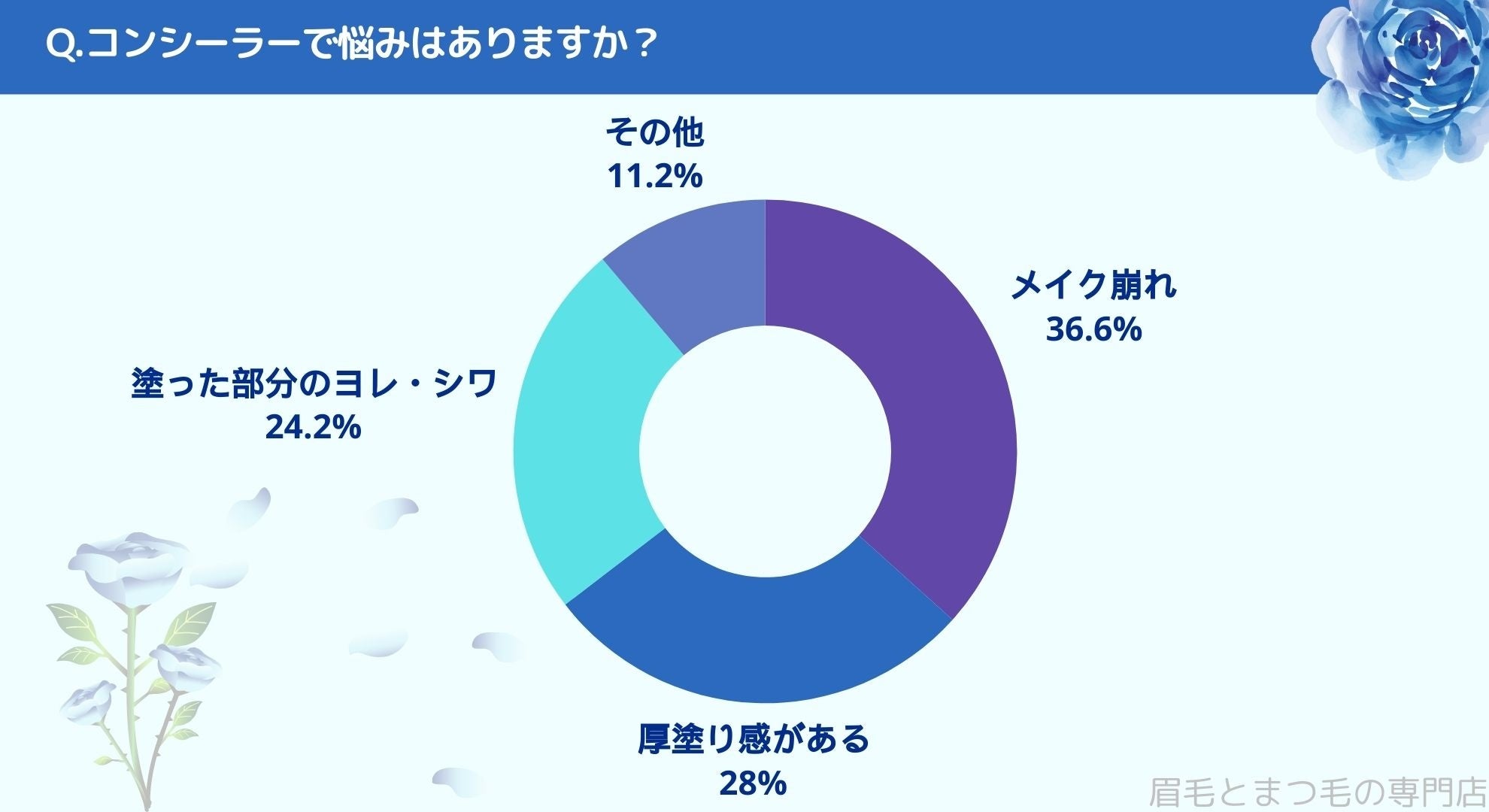 コンシーラーで何か悩みがあるかお聞きしたところ「メイク崩れ(36.6%)」、「厚塗り感がある(28%)」、「塗った部分のヨレ・シワ(24.2%)」、「その他(11.2%)」という結果になりました。