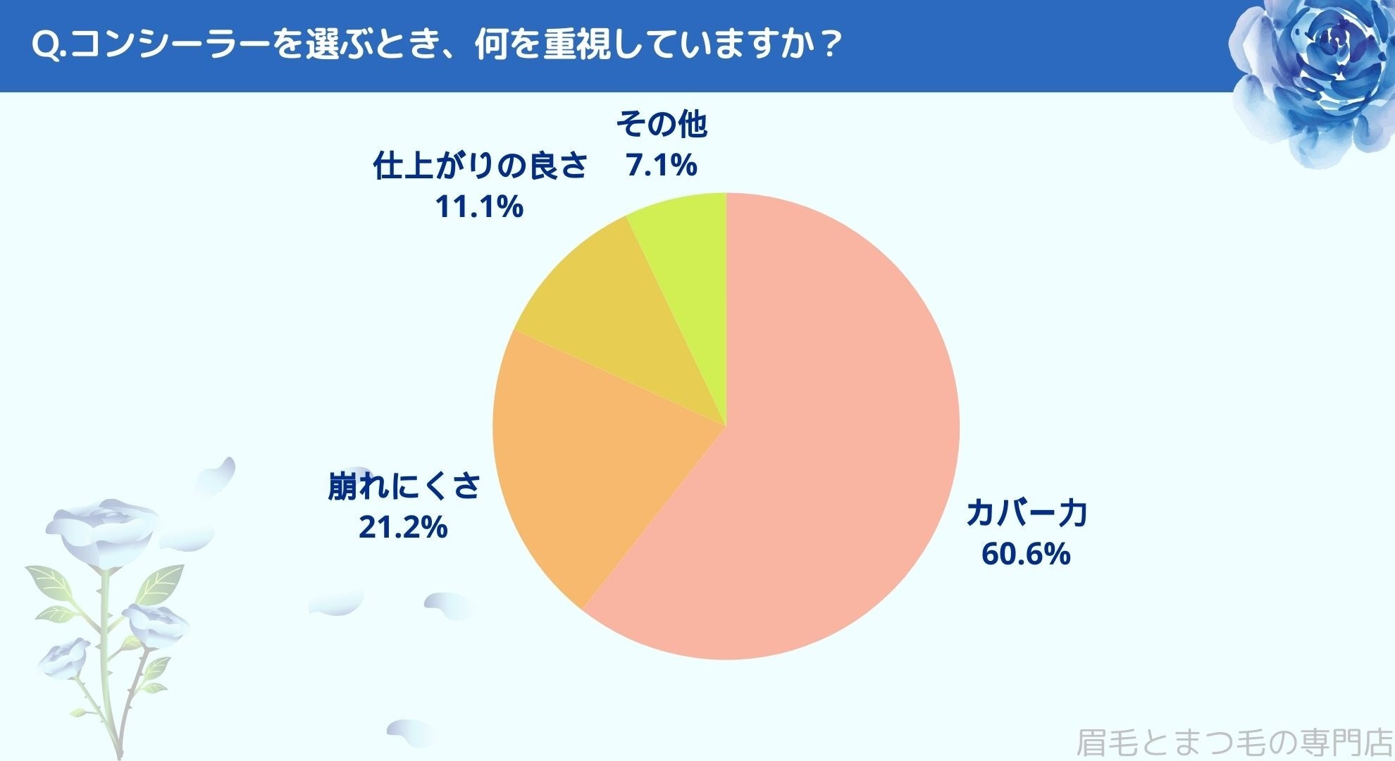コンシーラーを選ぶとき、何を重視しているかお聞きしたところ「カバー力(60.6%)」、「崩れにくさ(21.2%)」、「仕上がりの良さ(11.1%)」、「その他(7.1%)」という結果になりました。