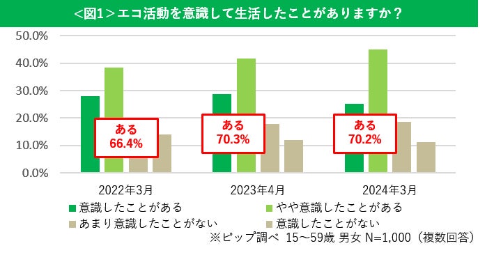 現在、多くの生活者が環境配慮への意識を持ち様々な取り組みを行っていますが、その取り組みは多岐に渡ります。ピップでは定期的にエコ活動について調査を行っており、2023年以降では7割が、「エコ活動を意識して生活したことがある」と回答し、エコ活動への意識がきちんと浸透していることが伺えます<図1>。また、これまで実施したことがあるエコ活動としては、「ゴミの分別(77.5%)」が最も多く、次いで「エコバッグの活用(75.5%)」が多い結果となりました<図2>。その他にも「節電(66.1%)」 「節水(60.1%)」「詰め替え商品を利用する(58.6%)」が続き、生活の中で意識しやすく、すぐに実践できるエコ活動が中心であるという結果となりました。