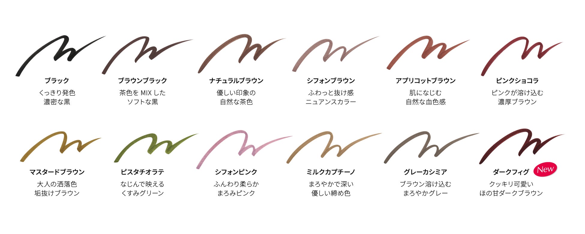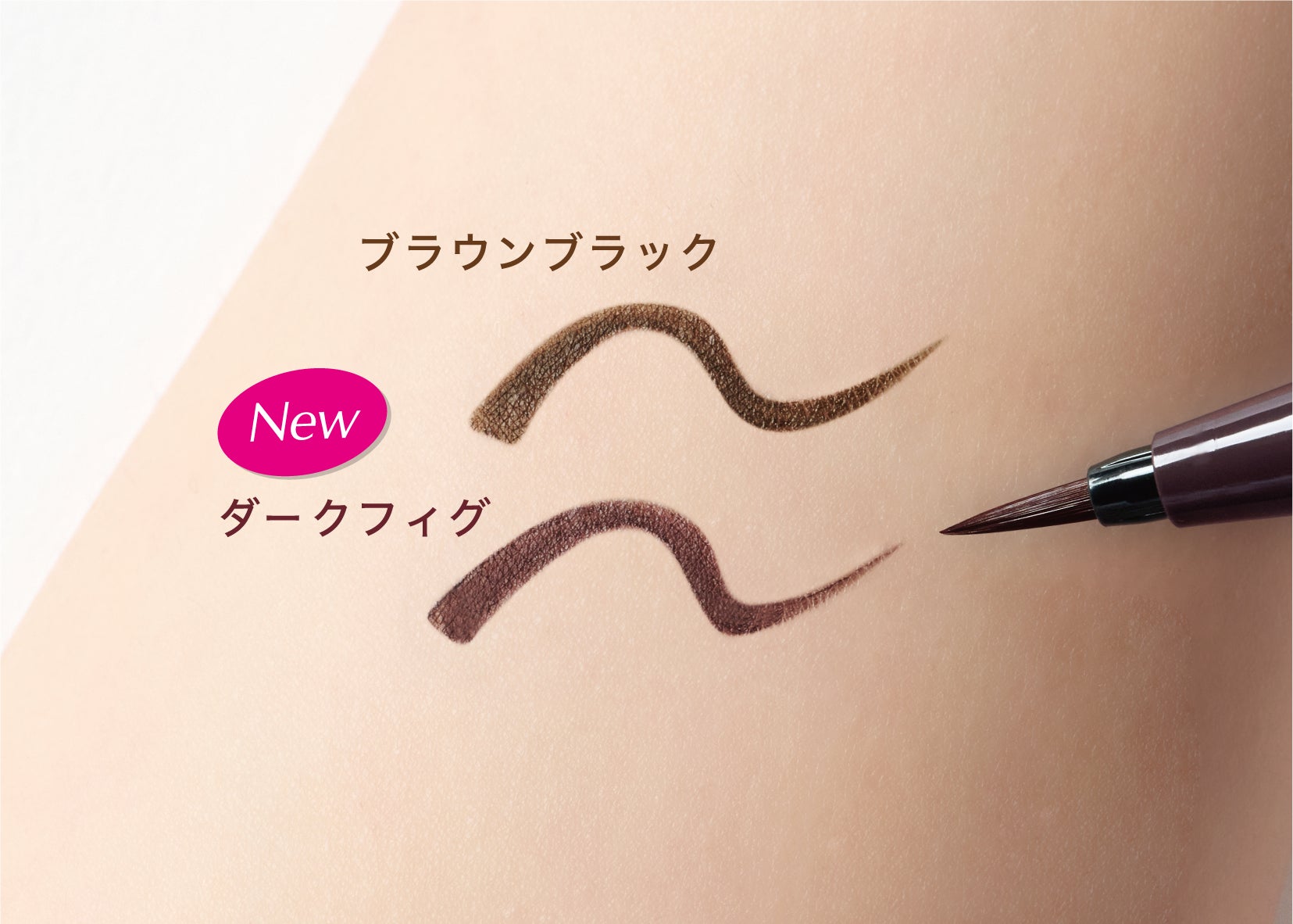 黒ほど強く主張せず茶色のようにぼやけない、アイライナーの定番として変わらず高い人気を得ている“ダークブラウン”。新色の『ダークフィグ』は、“ダークブラウン”にほんのり温かな甘みをプラスし、今っぽくアップデートさせた新定番カラーです。目元にスッとなじんでクッキリ可愛いラインが、日々のメイクを引き立てます。