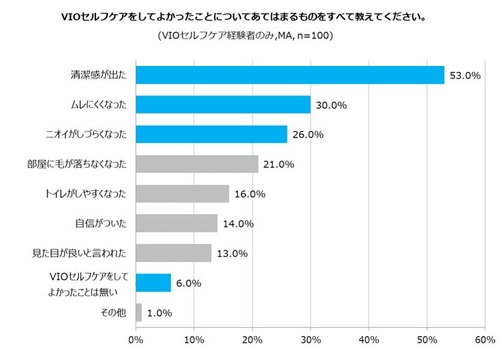 上位の回答には、「清潔感が出た(53.0%)」「ムレにくくなった(30.0%)」「ニオイがしづらくなった(26.0%)」といった回答が並びました。対して「VIOセルフケアをしてよかったことは無い」という回答は6.0%となりました。