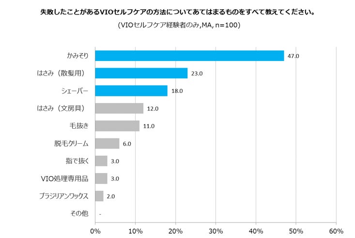続いて、失敗した要因を明らかにするために「失敗したことがあるVIOセルフケアの方法」について質問したところ、「かみそり(47.0%)」「はさみ(散髪用)(23.0%)」「シェーバー(18.0%)」が上位になりました。日常的にひげや眉を処理する道具をVIOにも使用し、失敗することが多い実態が明らかになりました。