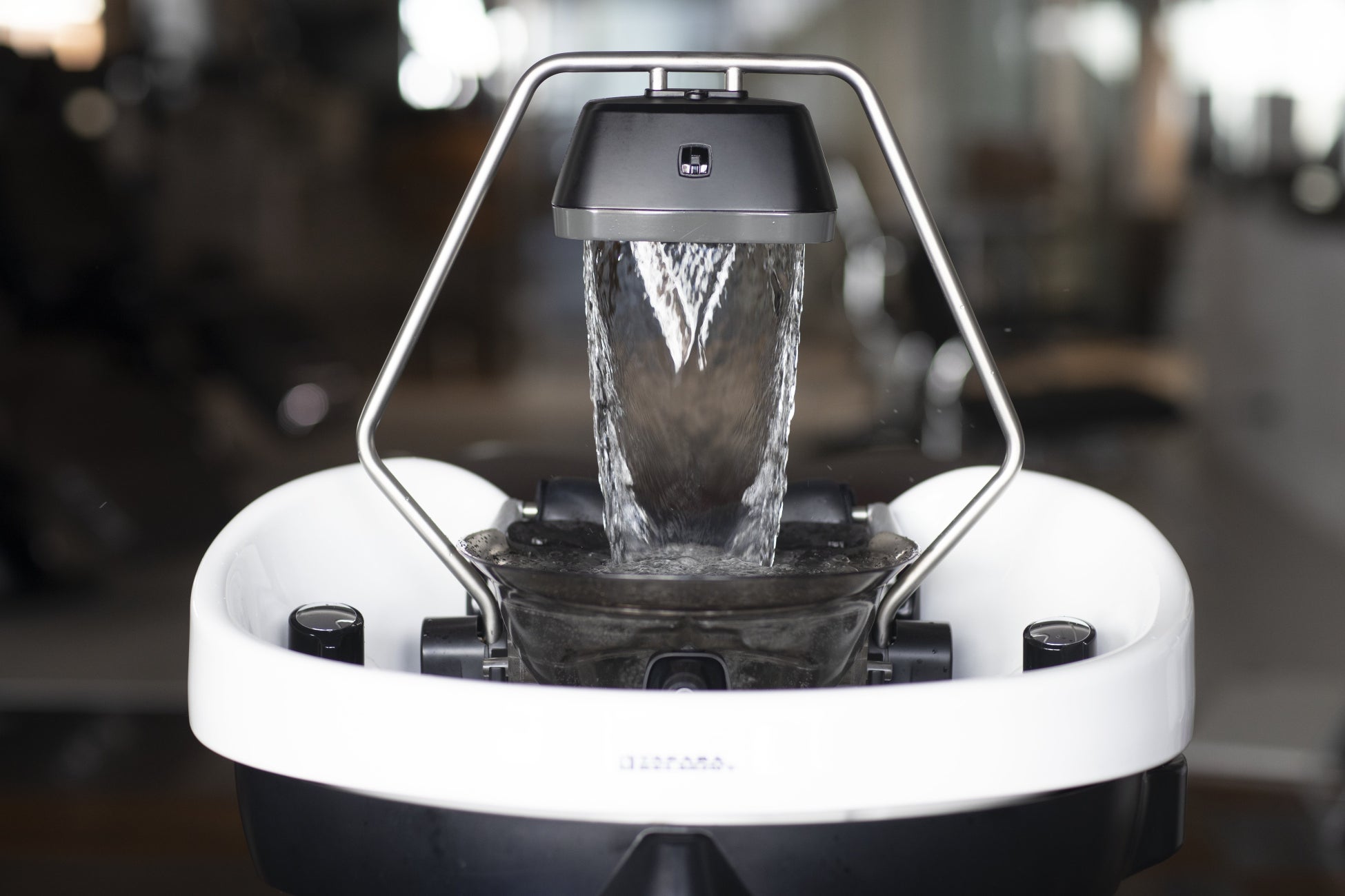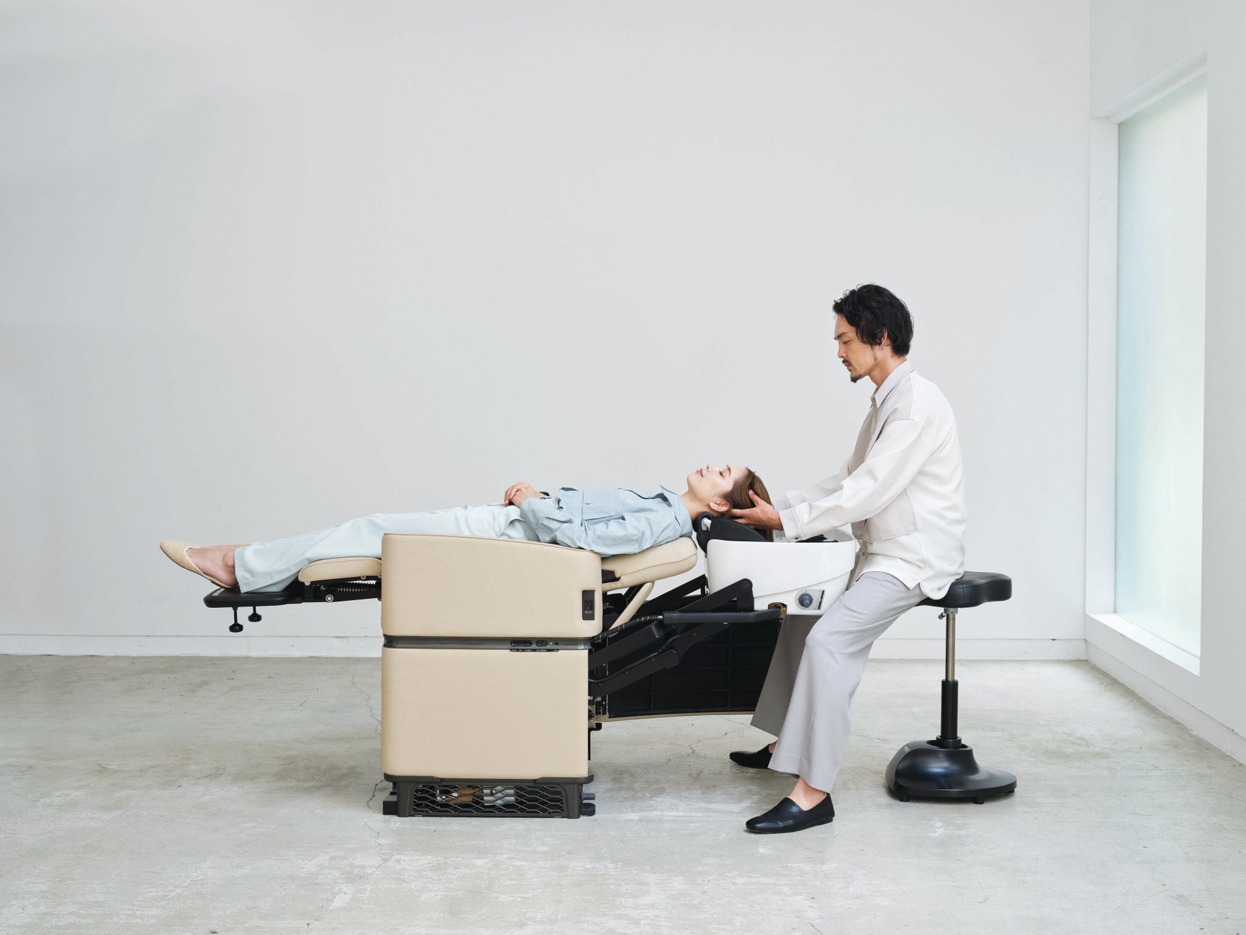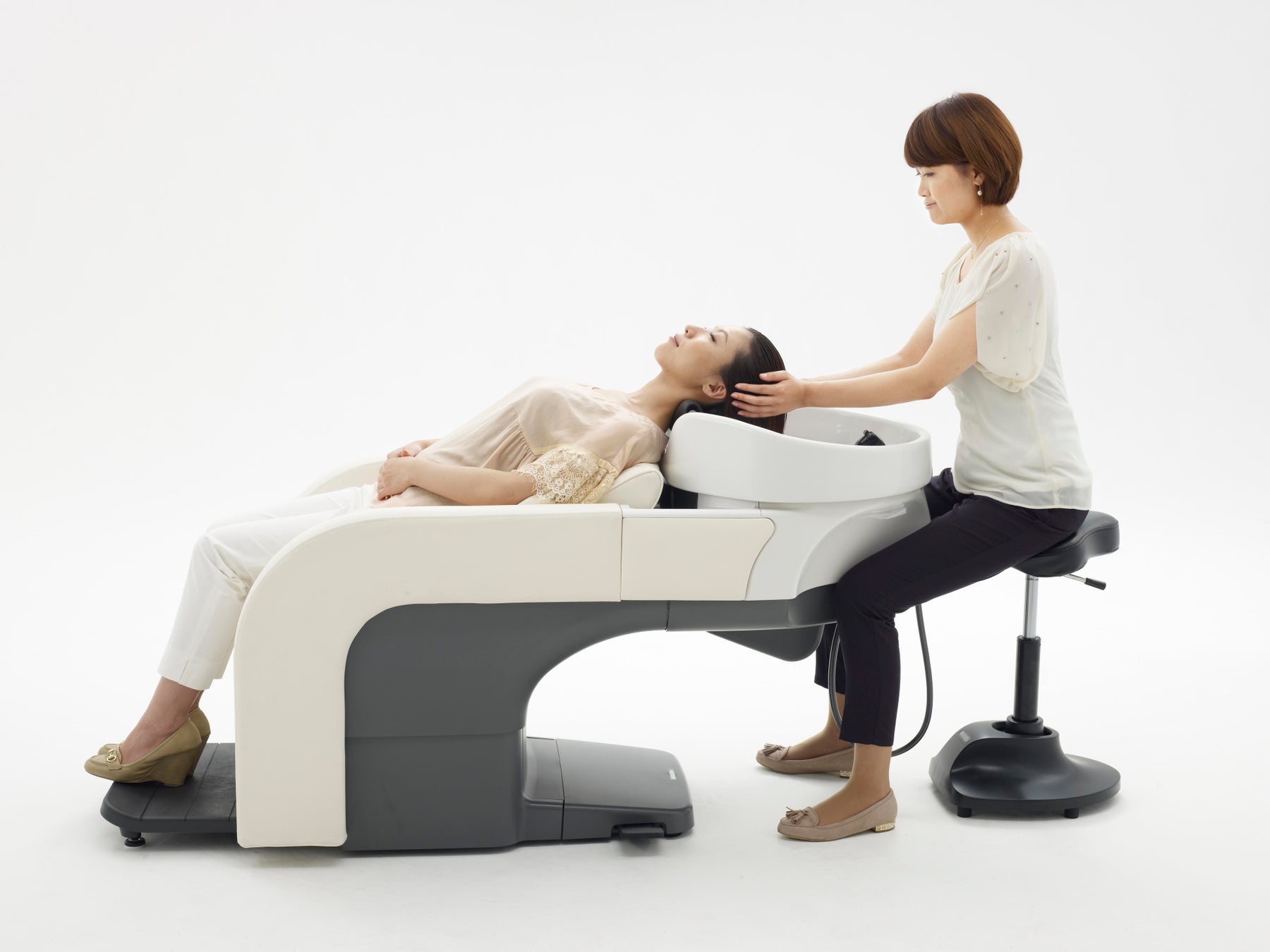 チェア内部に電動駆動のYUMEボウルが格納されており、この1台でシャンプーだけでなくカットなどの施術やヘッドスパまで対応します。