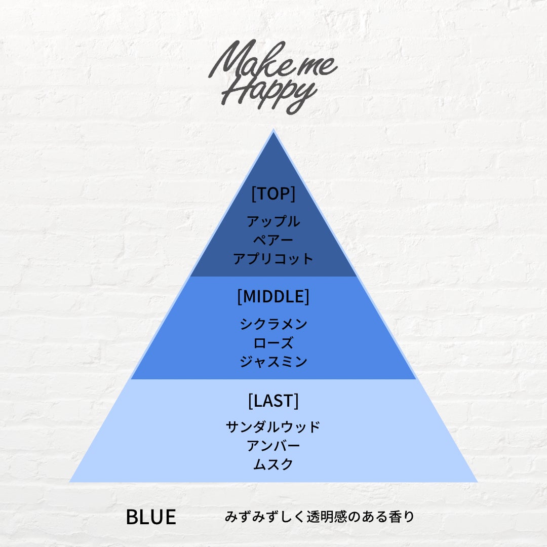 TOP:アップル、ペアー、アプリコット MIDDLE:シクラメン、ローズ、ジャスミン LAST:サンダルウッド、アンバー、ムスク