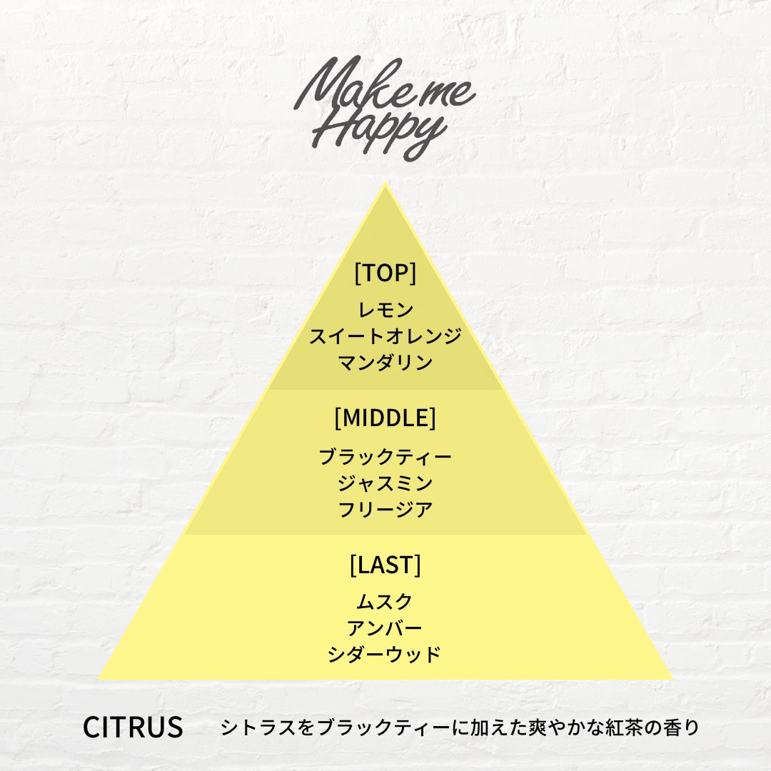 TOP:レモン、スイートオレンジ、マンダリン MIDDLE: ブラックティー、ジャスミン、フリージア