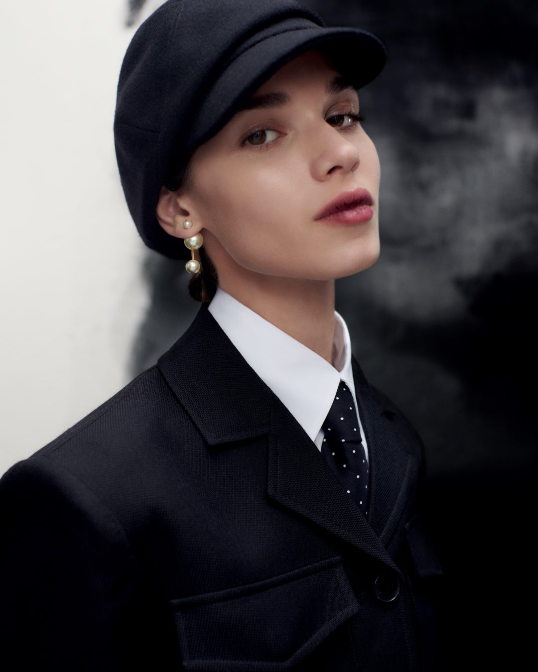 「今回のショーのために、マリア・グラツィア・キウリはシンプルでありながら力強いルックを求めました。透明感のある肌の上に、グルーミングされた眉で縁取られたヌーディーなアイメイクを完成させました。唇は、噛んだときのような深いパープルで彩られ、ほのかにダスティーピンクを添えています」