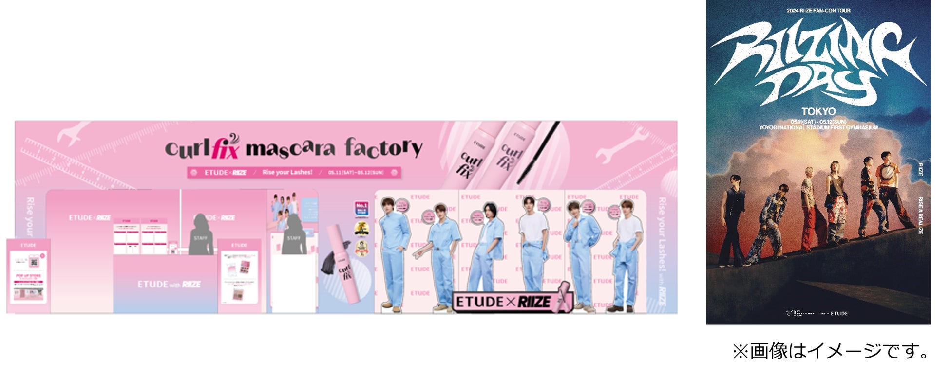 RIIZE初の日本単独公演 「2024 RIIZE FAN-CON ‘RIIZING DAY’ in TOKYO」にエチュード特設ブースを出展いたします。RIIZEの「カールフィックスマスカラ」ビジュアル撮影現場である“エチュードマスカラ工場”をモチーフにした場内には、RIIZE等身大パネルや、RIIZEのエチュード新ミューズ就任を記念して直接思いを届けることができる手書きメッセージボードを設置いたします。ぜひ足をお運びください。