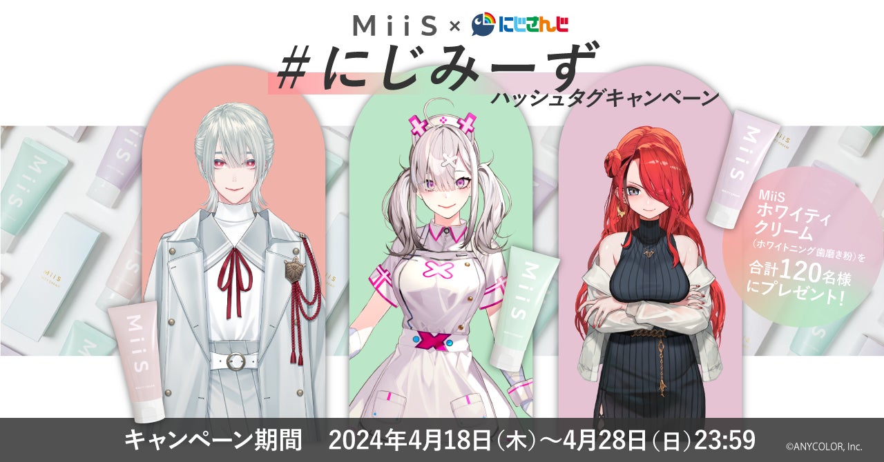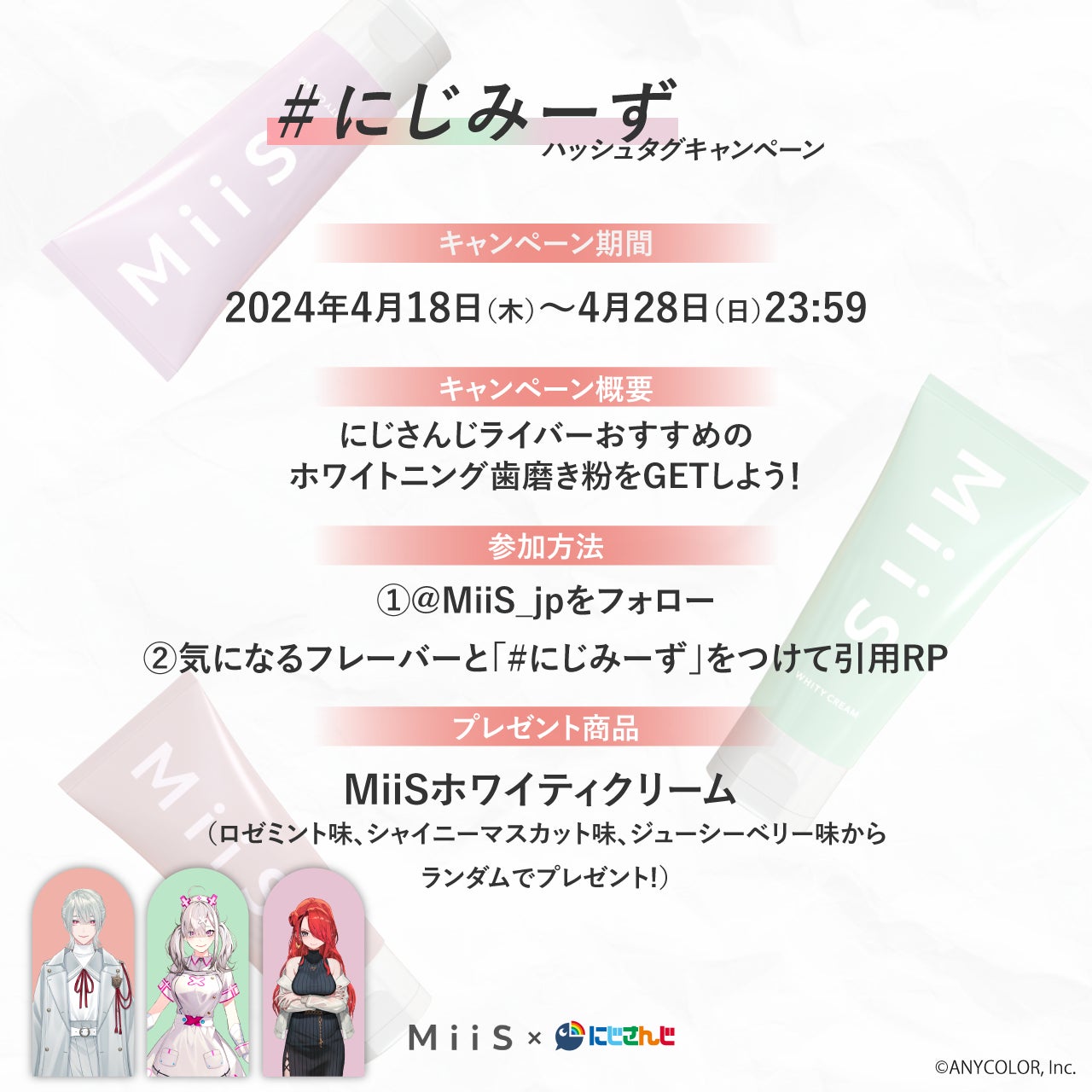 MiiSの公式Xアカウント(https://twitter.com/MiiS_jp)をフォロー、参加条件を満たしたうえで、該当のポストを引用リポストいただいたお客さまの中から、抽選で120名さまにライバーおすすめのホワイトニング*歯磨き粉「MiiS ホワイティクリーム」をプレゼントいたします。