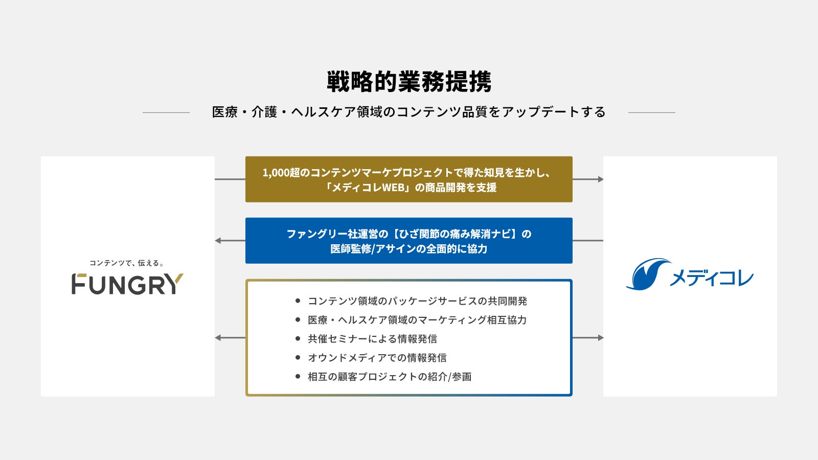 今回の業務提携を通じて、ファングリーのコンテンツプロデュース能力とメディコレの医師ネットワークによる支援能力のシナジーにより、信頼性や専門性が高く、分かりやすい医療・介護・ヘルスケア情報の提供を実現します。