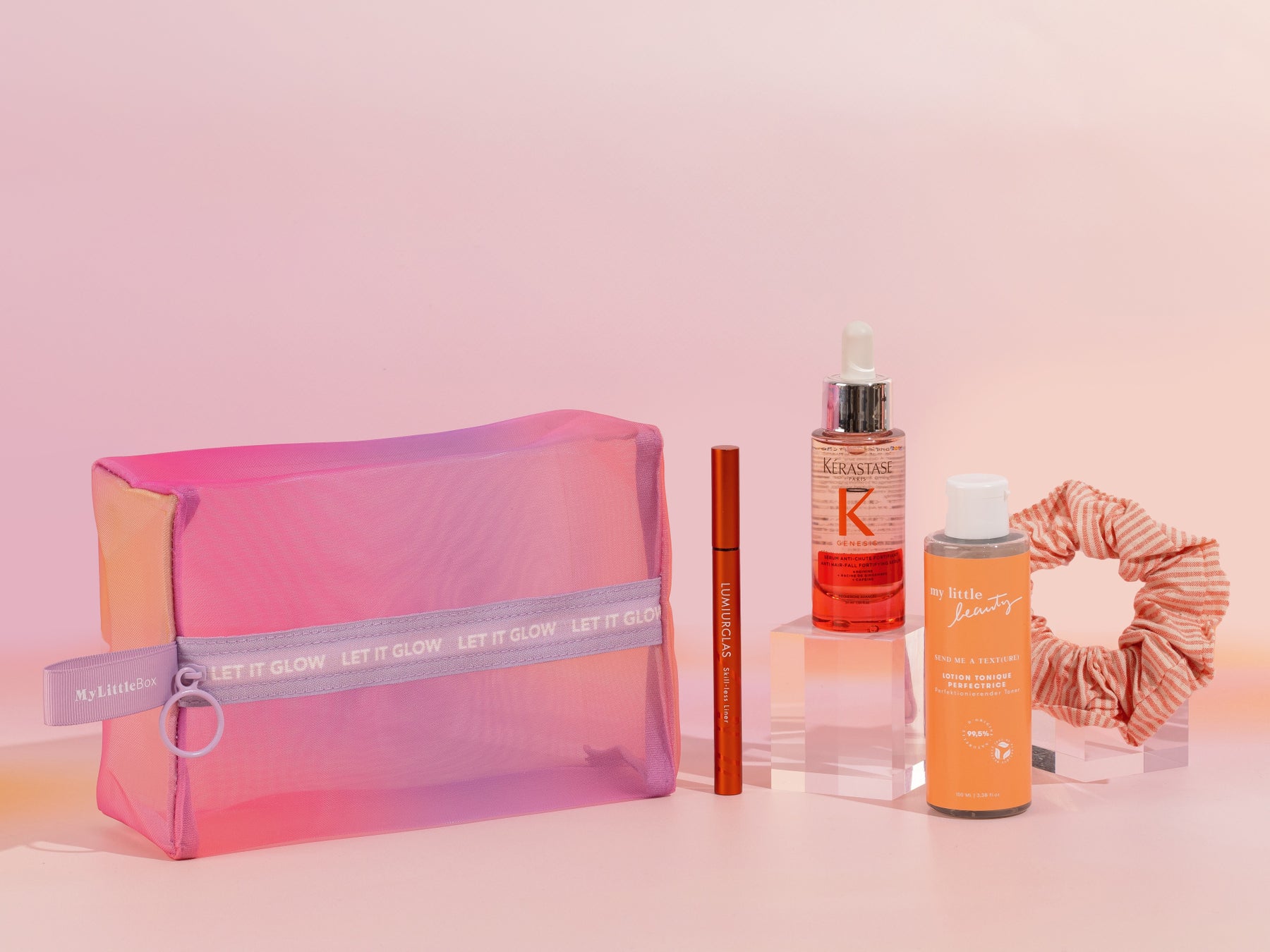 公式サイトでは、2024年5月1日より5月BOXの販売を開始。テーマは、1日の過ごし方に着目した“SUNRISE TO SUNSET”。お届けするライフスタイルアクセサリーは、美しいグラデーションが特徴的なメッシュポーチ。夕暮れの空からインスピレーションを受けたデザインです。注目の「KERASTASE」のヘアセラム、「LUMIURGLAS」のアイライナー、オリジナルのスキンケアアイテムに加え、ヘアアクセサリーをすべてポーチに詰めてお届けします。