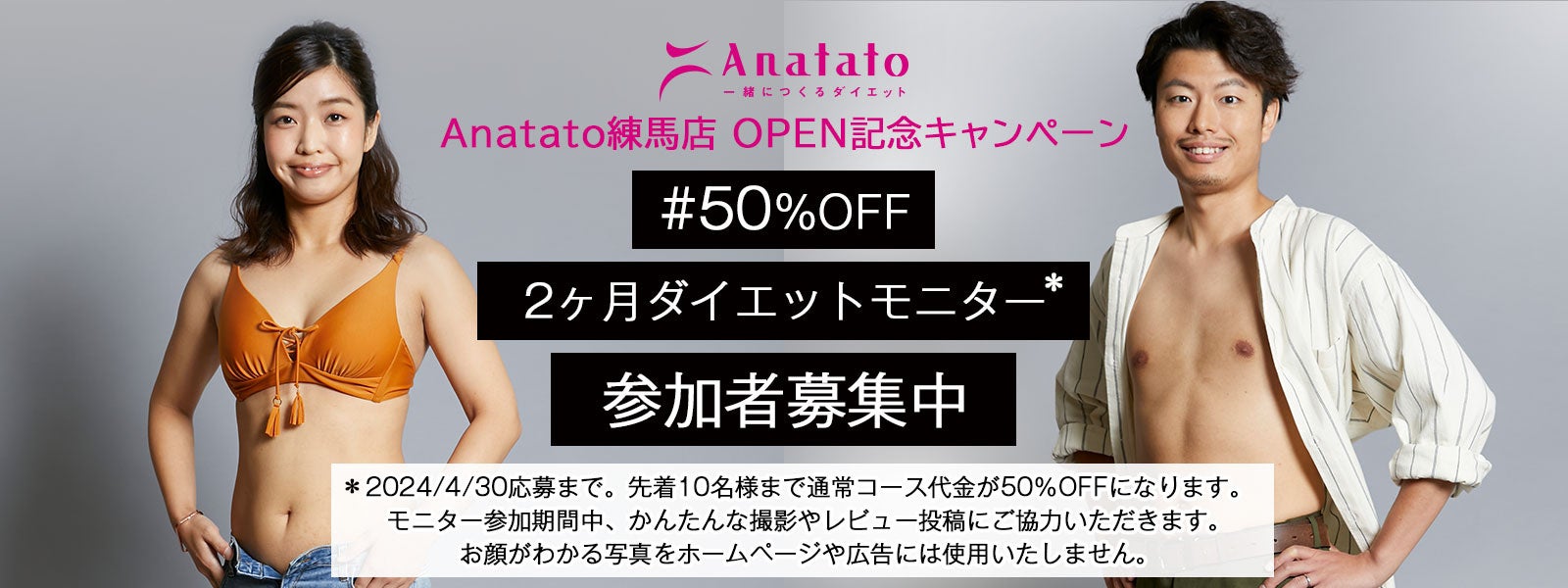 また、新規オープンの成城店、練馬店限定で、なんと50%OFFのキャンペーンも開催が決定しました。アンケートへのご協力などの一部条件がございますが、破格でAnatatoの3プロメソッドを受けられるチャンスです。是非一度お問い合わせ下さい。