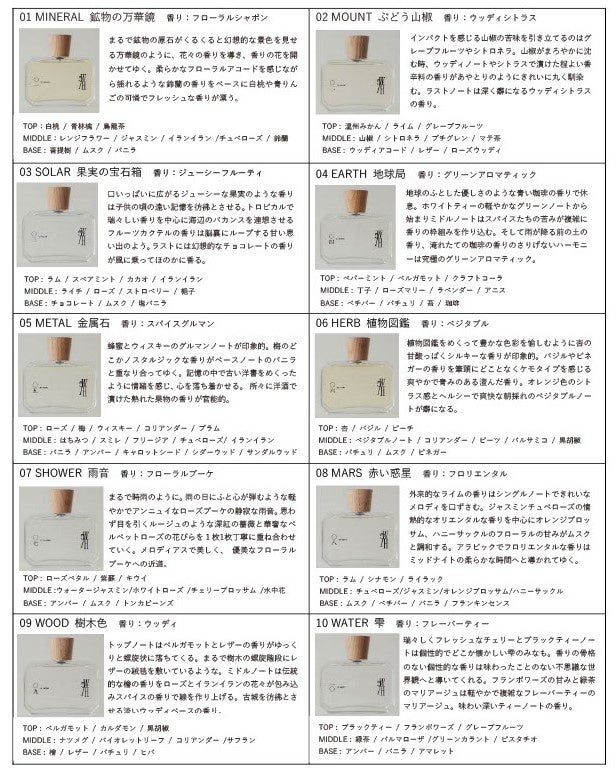 5W1Hはチャート診断から導きだされるフレグランスメゾンとして中田真由美の調香ワークショップを中心にファンから親しまれていました。10種の香りはどれも唯一無二としてファンから愛されています。今回の新作10種はかつての香りをアップデートし、パルファンとしてまったく新しい香りとして登場します。