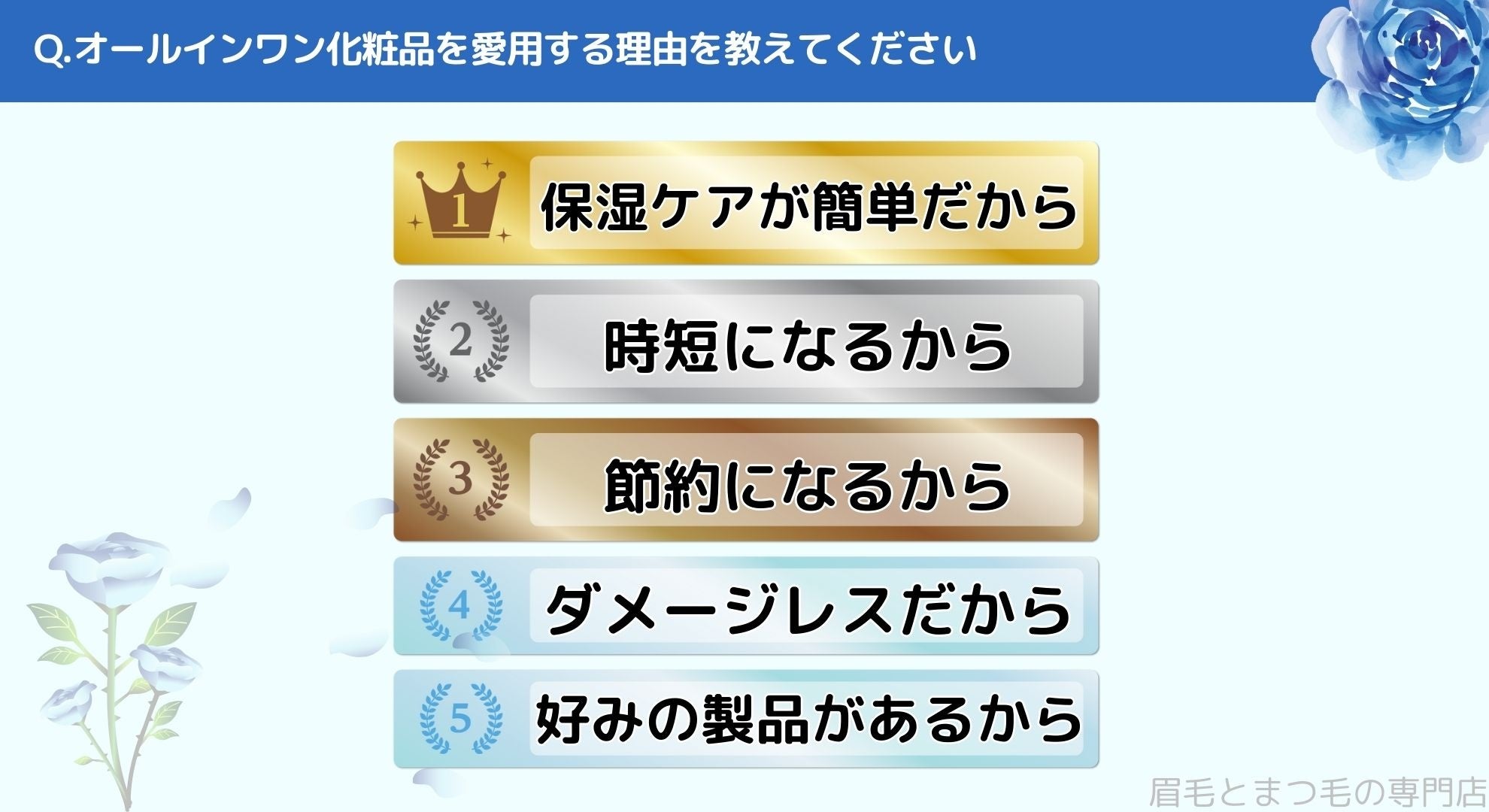 オールインワン化粧品を愛用する理由をお聞きしたところ「1位>保湿ケアが簡単だから」、「2位>時短になるから」、「3位>節約になるから」、「4位>ダメージレスだから」、「5位>好みの製品があるから」という結果になりました。