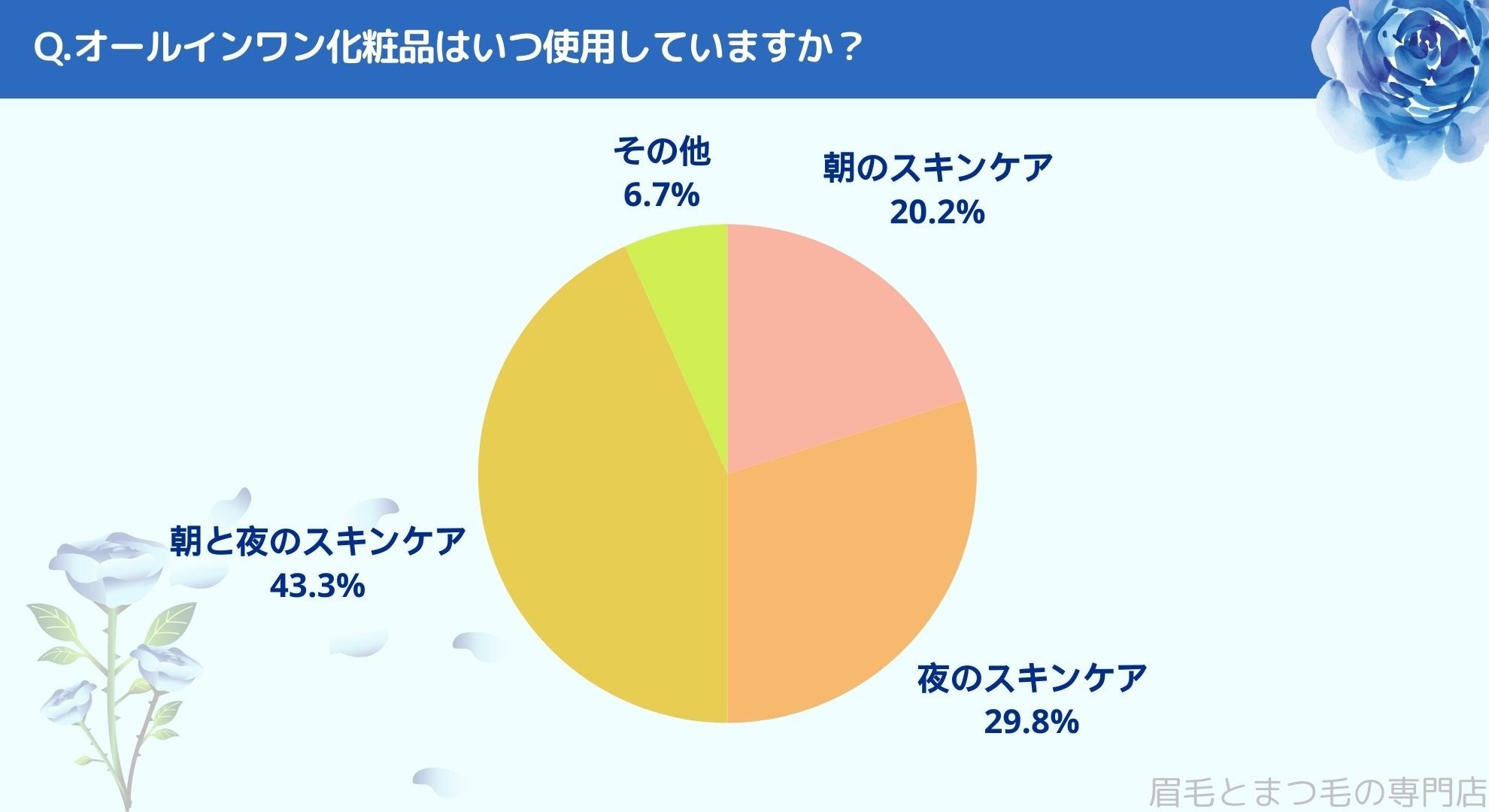 オールイワン化粧品をいつ使っているかお聞きしたところ「朝のスキンケア(20.2%)」、「夜のスキンケア(29.8%)」、「朝と夜のスキンケア(43.3%)」、「その他(6.7%)」という結果になりました。