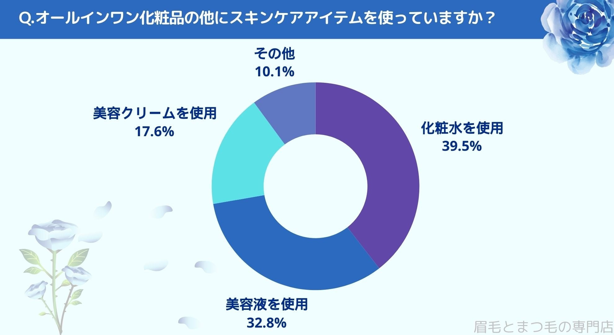 オールイワン化粧品の他にスキンケアアイテムを使っているかお聞きしたところ「化粧水を使用(39.5%)」、「美容液を使用(32.8%)」、「美容クリームを使用(17.6%)」、「その他(10.1%)」という結果になりました。