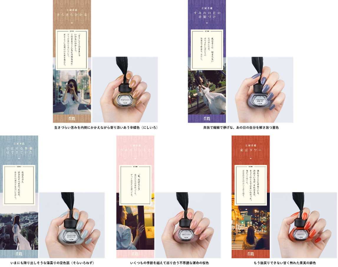 今回発売するのは、『きらきらひかる』『つめたいよるに』『すみれの花の砂糖づけ』『号泣する準備はできていた』『東京タワー』の5作品をもとにした、全5色のネイルポリッシュです。