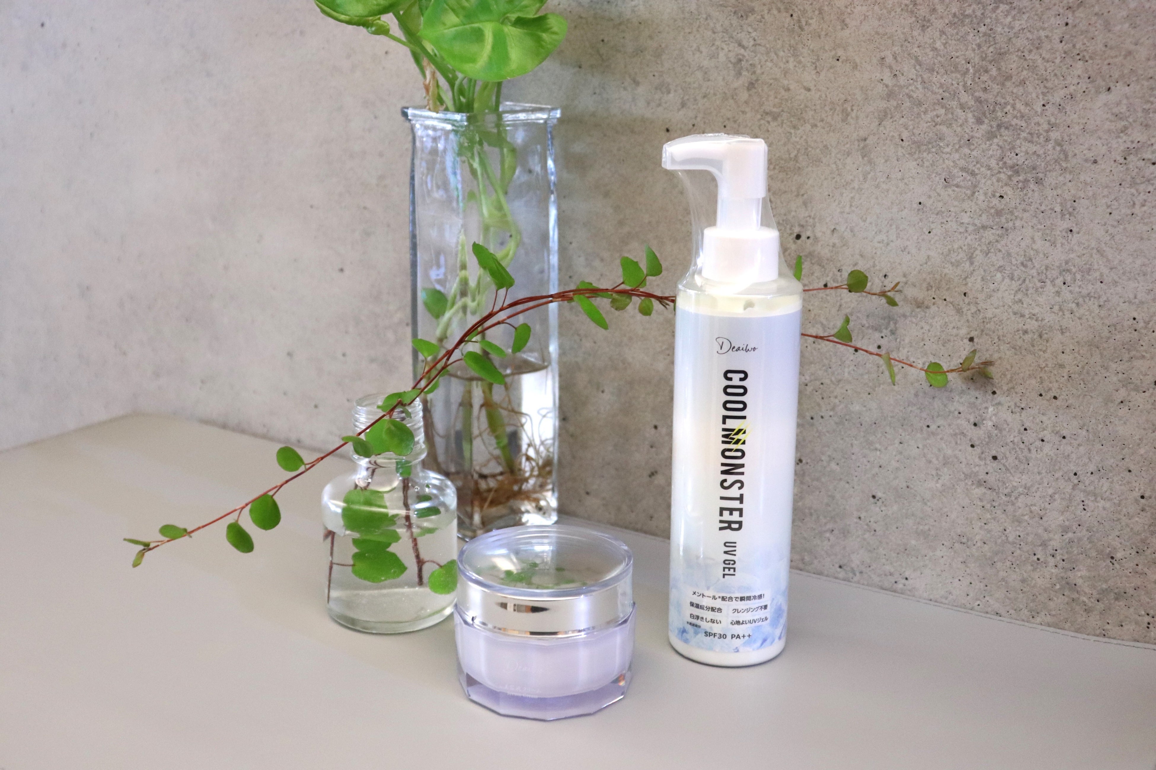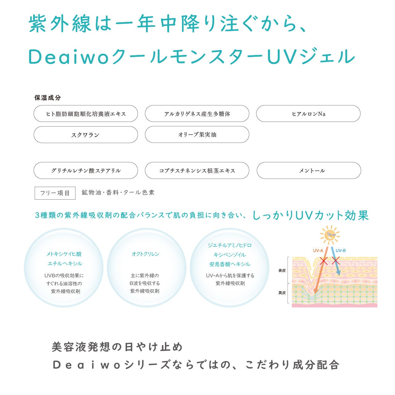 Deaiwoの人気商品「デアイヲビヨウエキクリーム」「デアイヲスペシャルクリーム」のコンセプト成分であるグリチルレチン酸ステアリル、コプチスチネンシス根茎エキス、ヒト脂肪細胞順化培養液エキス、ヒアルロン酸Na、スクワラン等をベースに、Deaiwoシリーズでは、初配合となるアルカリゲネス産生多糖体をプラス。サラッとのびの良いジェルでありながら、保湿力の高い商品を目指しました。4月から本格的に増える紫外線量とともに、気温が上がる季節に発売を意識して、ひんやりとした付け心地を追求すべく、清涼成分メントールをタップリと配合。UVケア商品にとって、肝心の紫外線カット効果として、3種類の紫外線吸収剤をバランスよく配合。肌への負担に向き合い、SPF30 PA++でありながら、しっかりUVカットを実現しています。