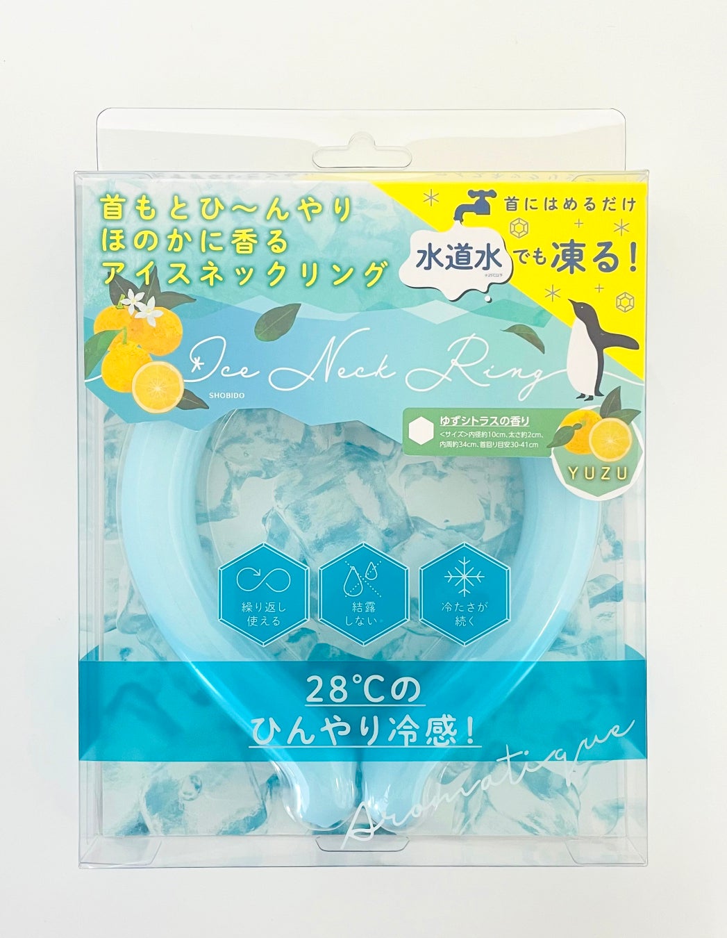 28℃で溶け始め、適度な冷たさがゆるやかに持続する⾸もと冷却リング。サイズは⼤⼩2種類、オシャレなリバーシブルカラーで年齢性別を問わずお使いいただける「通常品」と、ミントとゆずがほのかに⾹る「⾹り付き」、全6種類展開です。