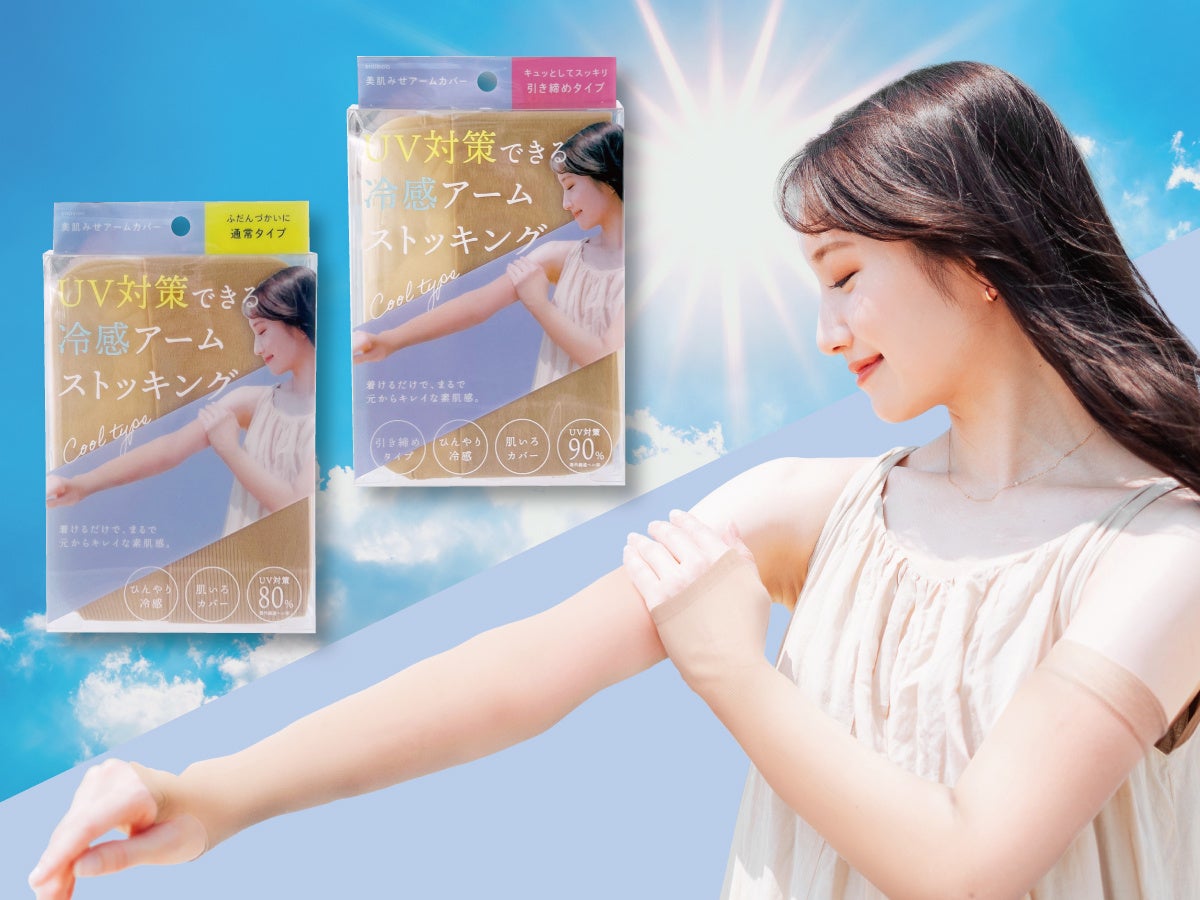 シミやあざなどの肌悩みを⾃然にカバーし、まるで元からキレイな美肌にみせてくれるアームカバー。親指⽳付きで⼿の甲までしっかりUV対策でき、冷感タイプなので⽇差しが強く汗ばむ時期に⼤活躍。お好みや⽤途に合わせて選べる「通常タイプ」と「引き締めタイプ」の2種類展開です。