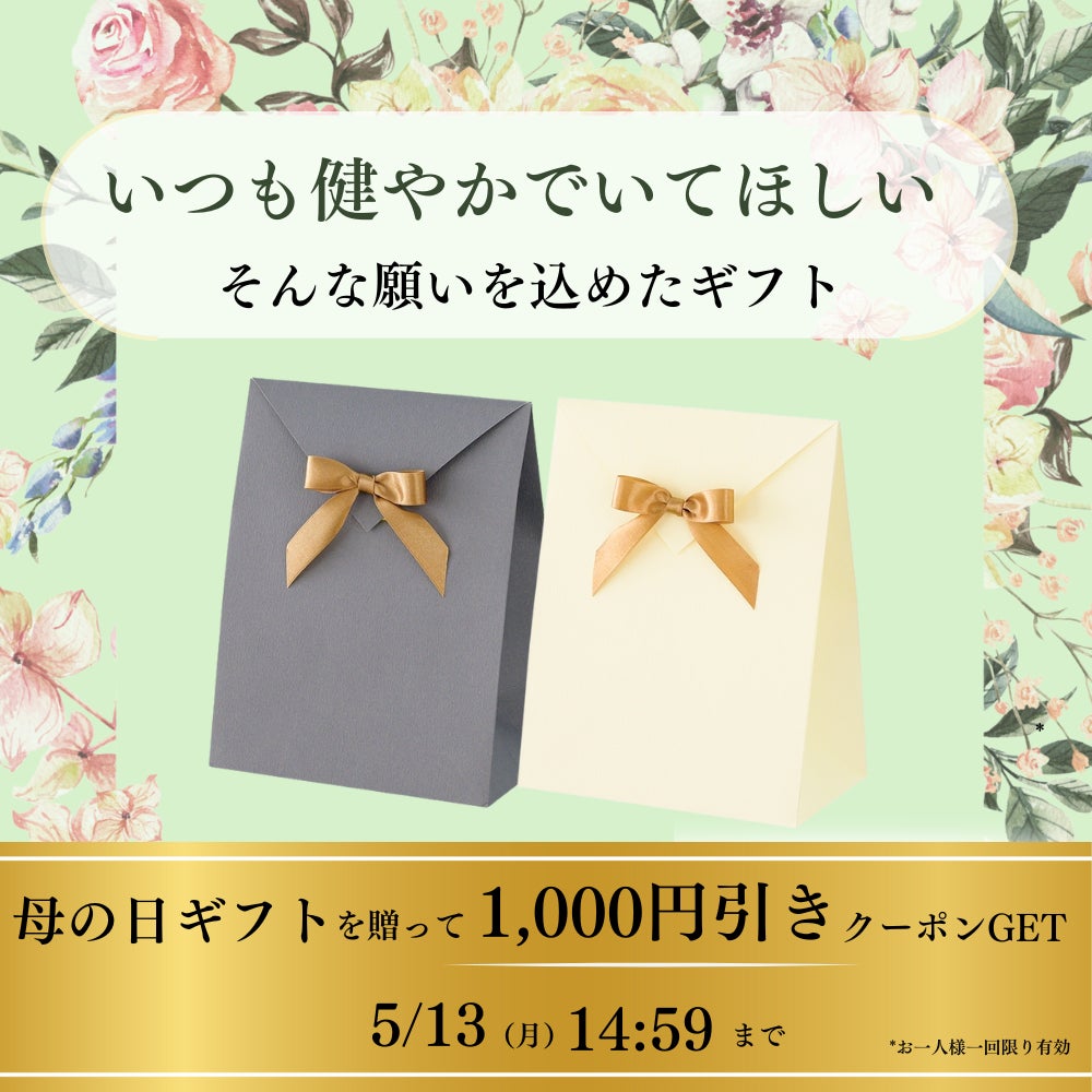 本キャンペーン期間中に迎える5月12日の母の日に合わせ、「健活手帖通販」でギフトパッケージの商品をご購入いただくと、次回のお買い物でご利用いただける1,000円割引のクーポンをご提供いたします。日頃の感謝の想いを込めたギフトとしてご利用いただきたいと考えております。