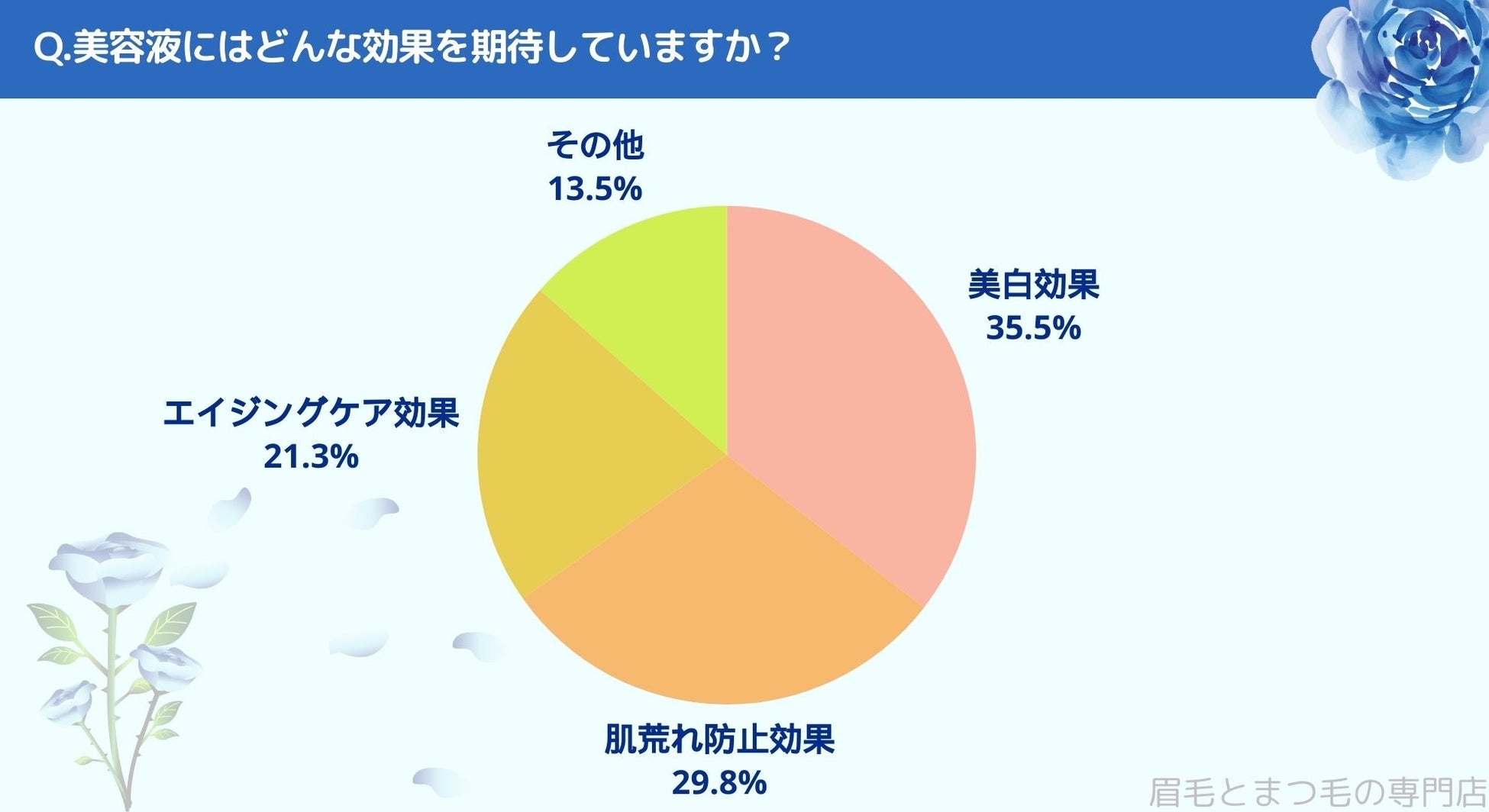 美容液にどんな効果を期待しているかお聞きしたところ「美白効果(35.5%)」、「肌荒れ防止効果(29.8%)」、「エイジングケア効果(21.3%)」という結果になりました。