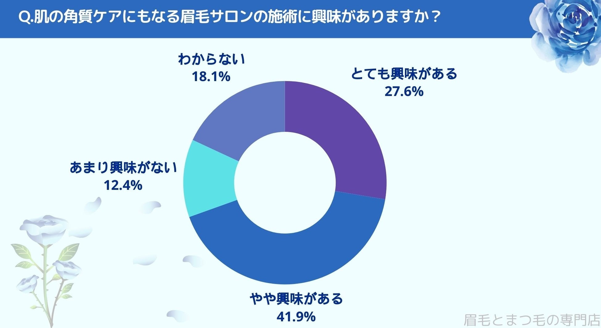 肌の角質ケアにもなる眉毛サロンの施術に興味があるかお聞きしたところ「とても興味がある(27.6%)」、「やや興味がある(41.9%)」、「あまり興味がない(12.4%)」、「わからない(18.1%)」という結果になりました。
