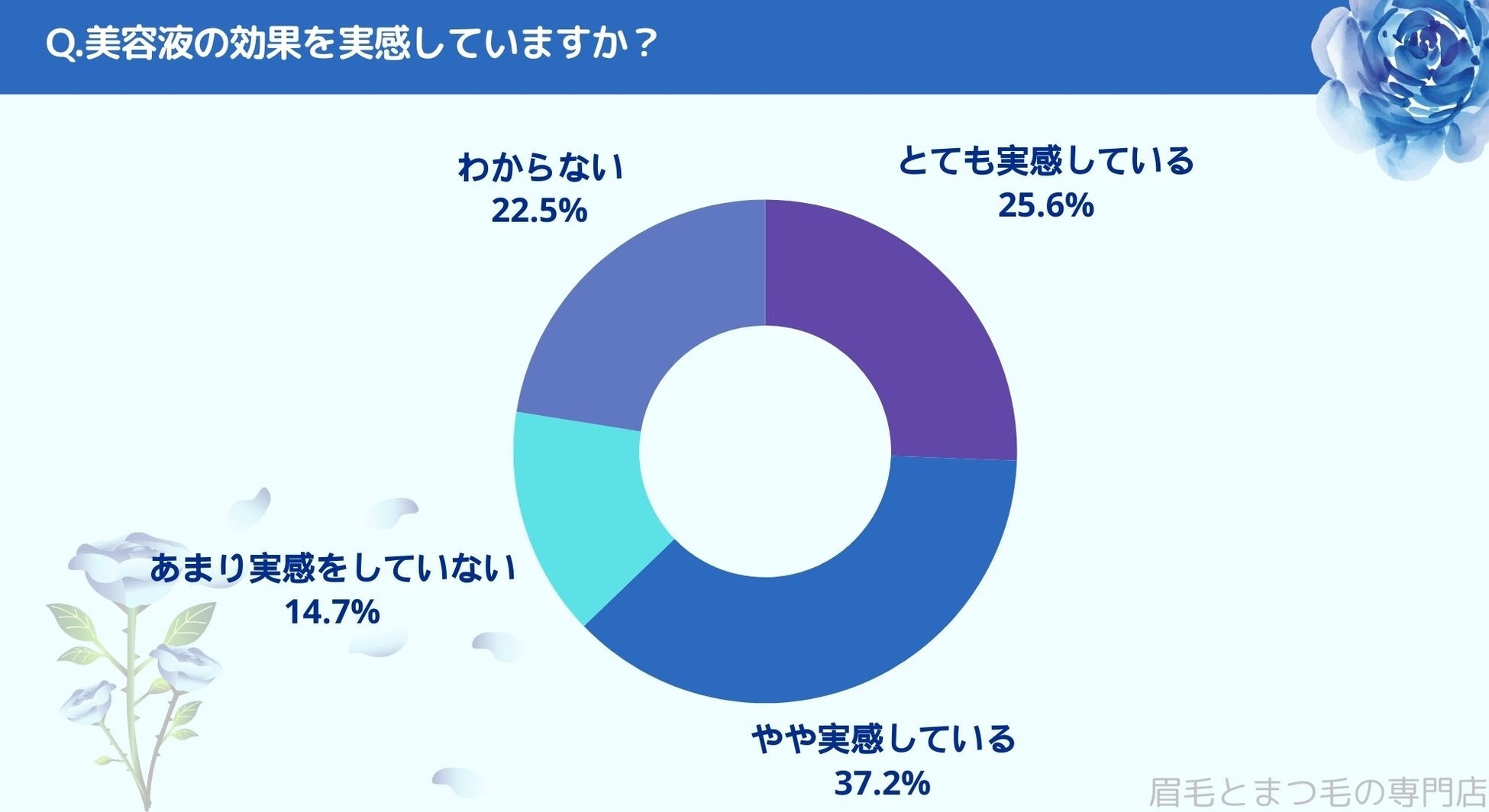 美容液の効果を実感しているかお聞きしたところ「とても実感している(25.6%)」、「やや実感している(37.2%)」、「あまり実感をしていない(14.7%)」、「わからない(22.5%)」という結果になりました。