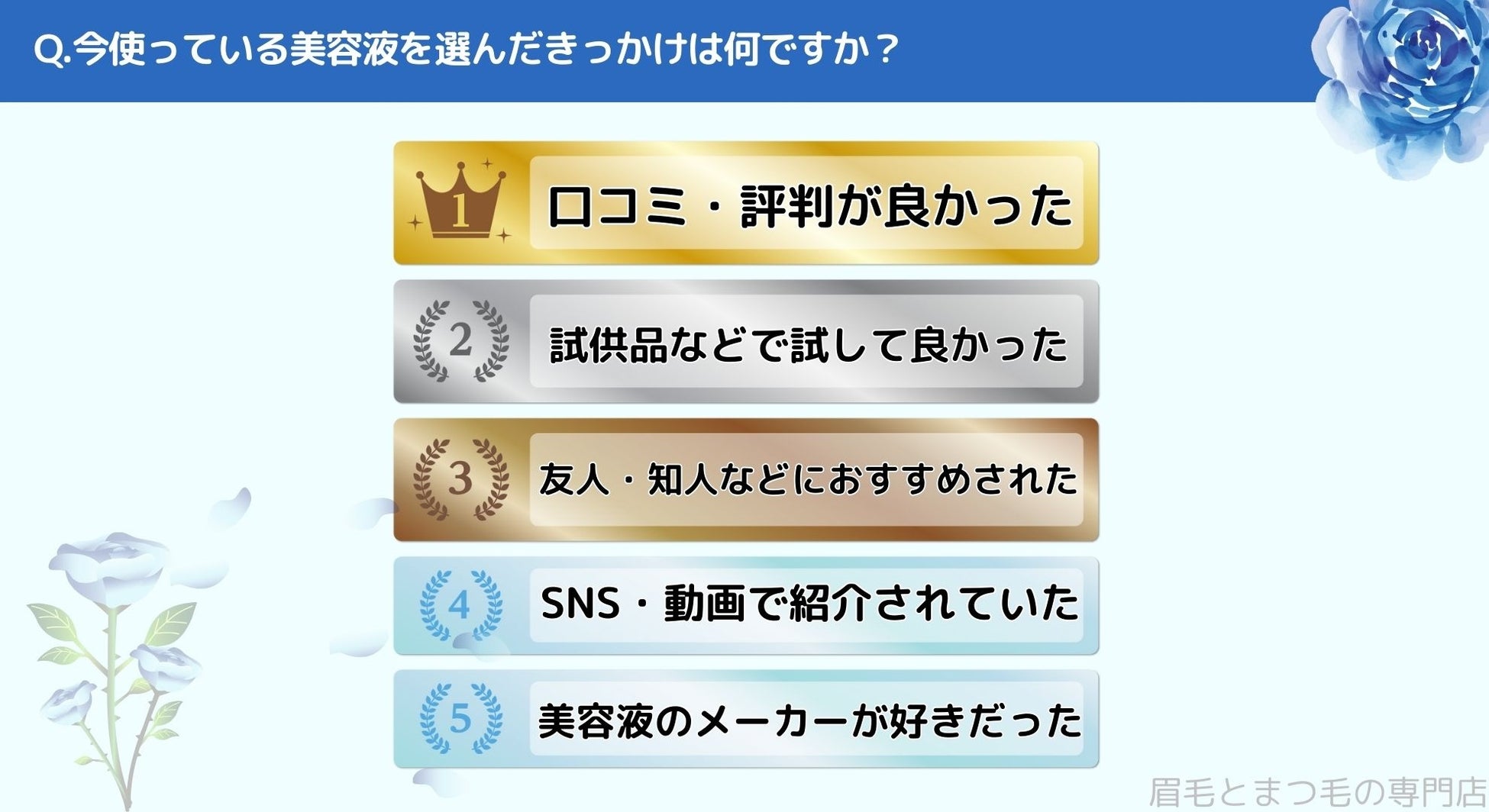 そこで今回の調査では、美容液を選んだきっかけについてアンケートを実施しました。ぜひ、チェックしてみてください。