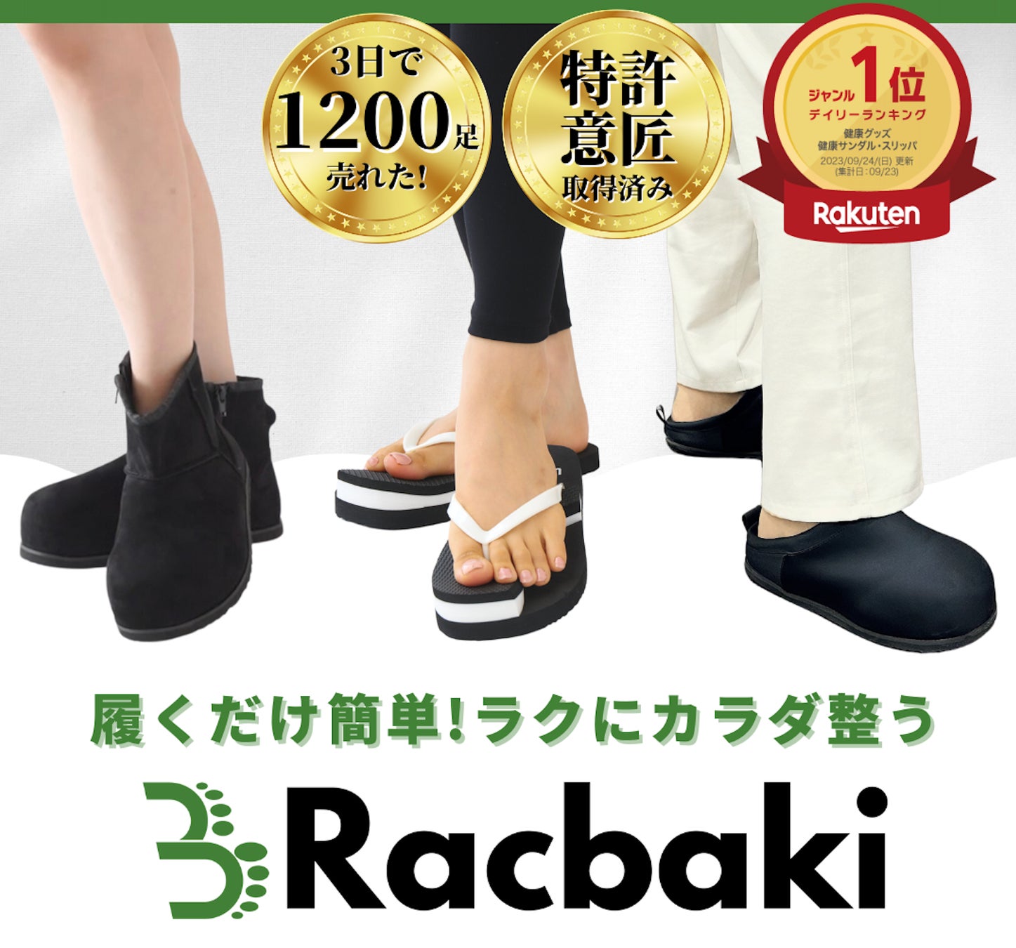 CELLZERO.式を元に靴が太る原因と考え、足元から痩せやすい身体作りをサポートするアイテムとして開発されたRacbaki(ラクバキ)。こちらは特許も取得したオリジナルの形状で、履いて歩くだけで楽にシェイプアップ効果が期待できると、SNSにて話題に。発売開始後わずか3日で1,200足を販売し、即完売。楽天市場でも常にランキング1位(*2)を獲得している大人気商品です。