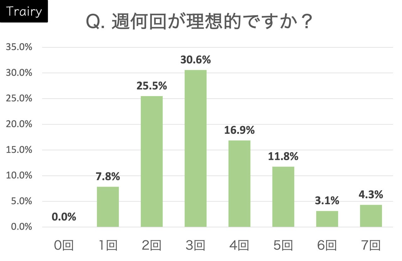 1週間でジムに通う平均回数は3.26回。平均すると、今より週にもう1回程度多いのが理想的だと考えている人が多いことがわかりました。