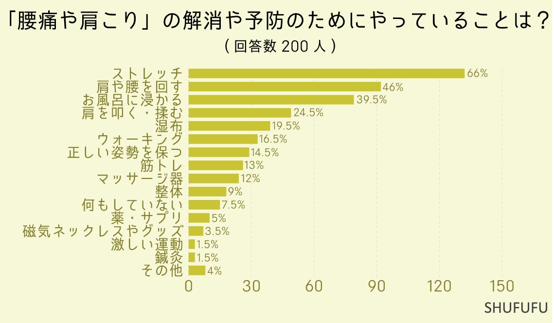 「腰痛や肩こり」の解消や予防のためにやっていることを尋ねたところ、1位は「ストレッチ(66%)」、2位「肩や腰を回す(46%)」となりました。体をほぐすことで血行がよくなり、筋肉のこわばりが緩和されるそうですね。お家で簡単にできて手軽な方法なので、実行している方が多いようです。