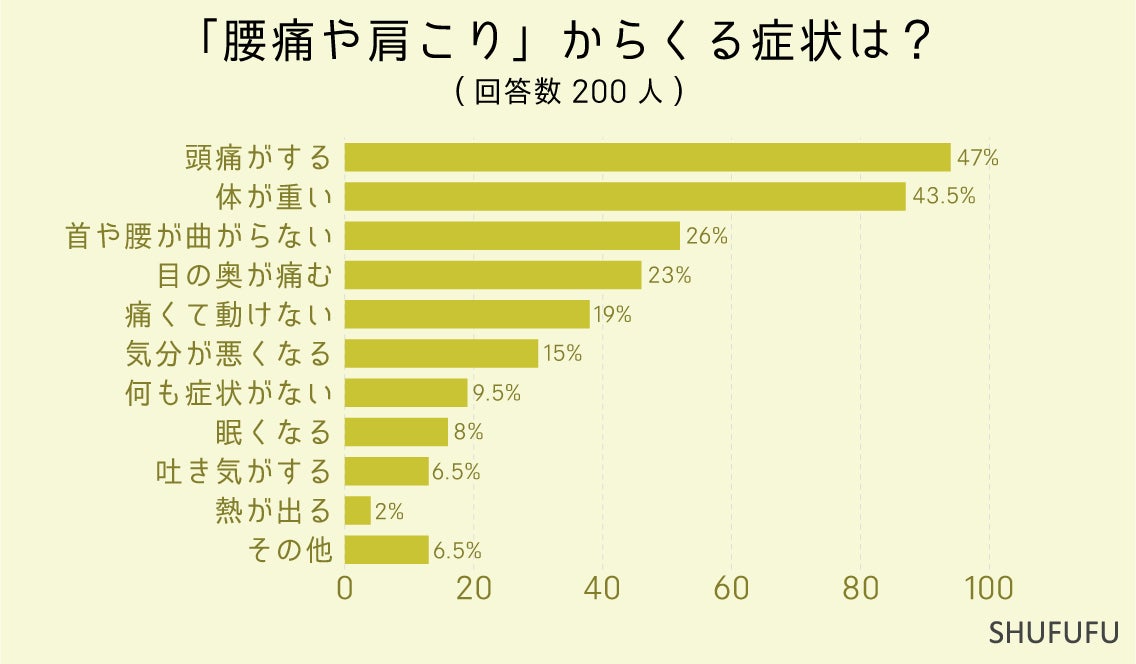 「腰痛や肩こり」からくる症状に関しては1位「頭痛がする(47%)」、2位「体が重い(43.5%)」でした。肩こりがひどいと血流不足になり、頭痛の原因になるようです。肩こりや腰痛に悩んでいる方は凝っている直接の部位以外の箇所の痛みや症状にも悩んでいる方が多そうです。